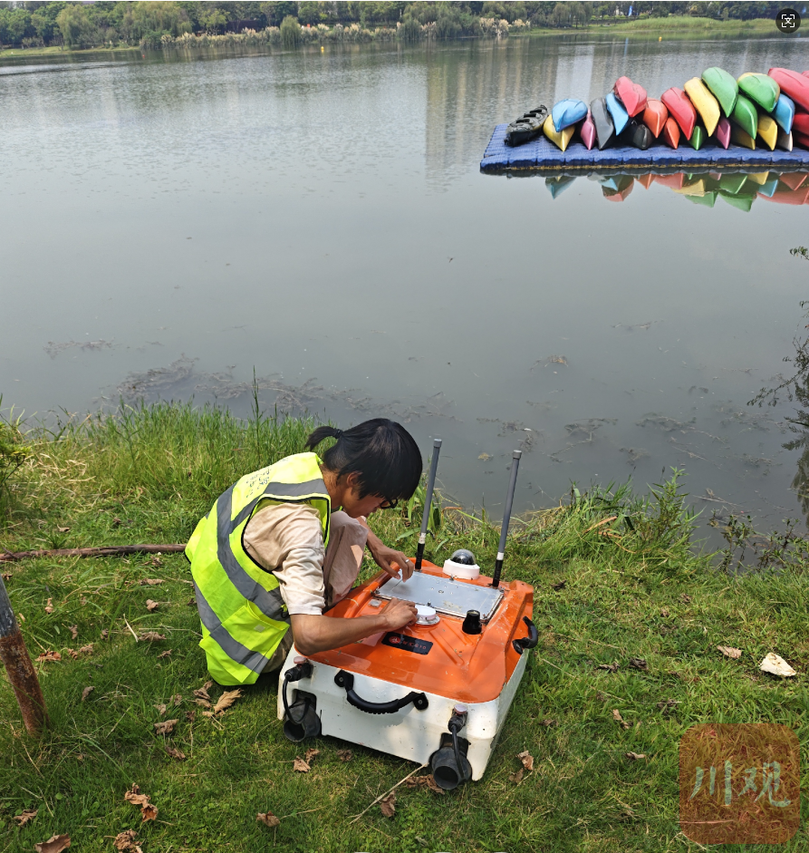调查人员在锦城湖畔进行地表水调查。受访者供图