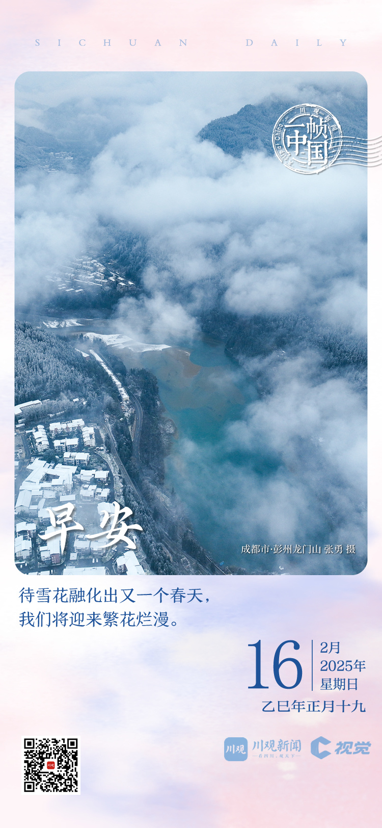 每一天的《一帧中国》,都诱人心动。看这薄雾弥漫,松柏凝霜,山峦起伏,银装素裹,春雪增春色,水墨绘长卷,多想一下就“飞”过去,体验这份悠然静谧。
