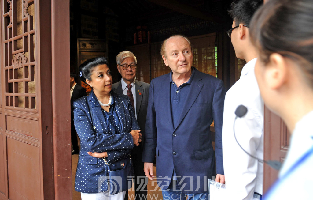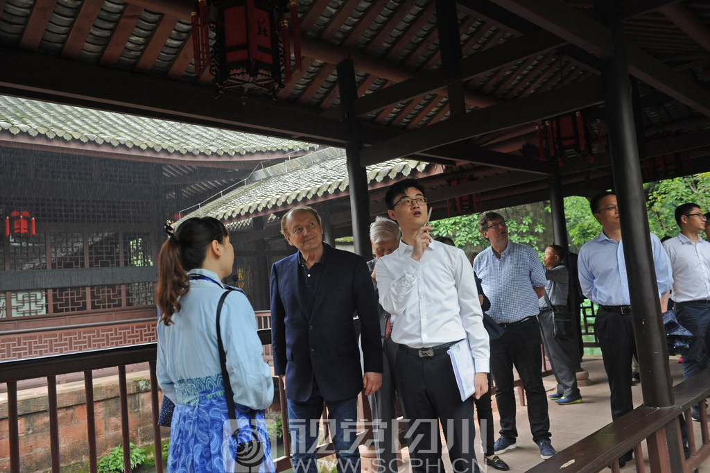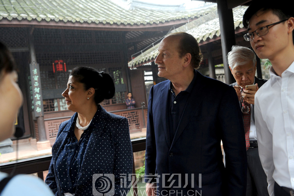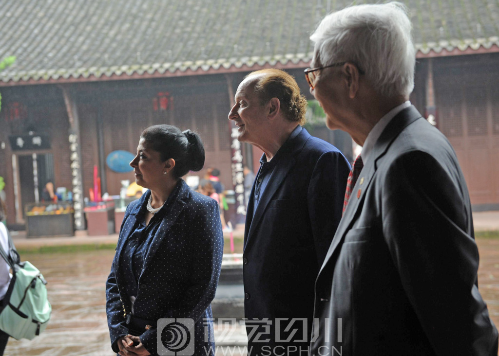 罗伯特·默顿(中)及夫人(左)在三苏祠参观。