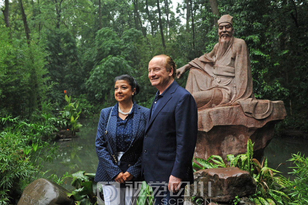 罗伯特·默顿及夫人在三苏祠东坡盘坐像前合影留念。