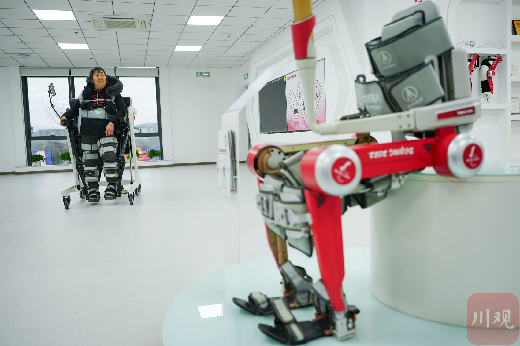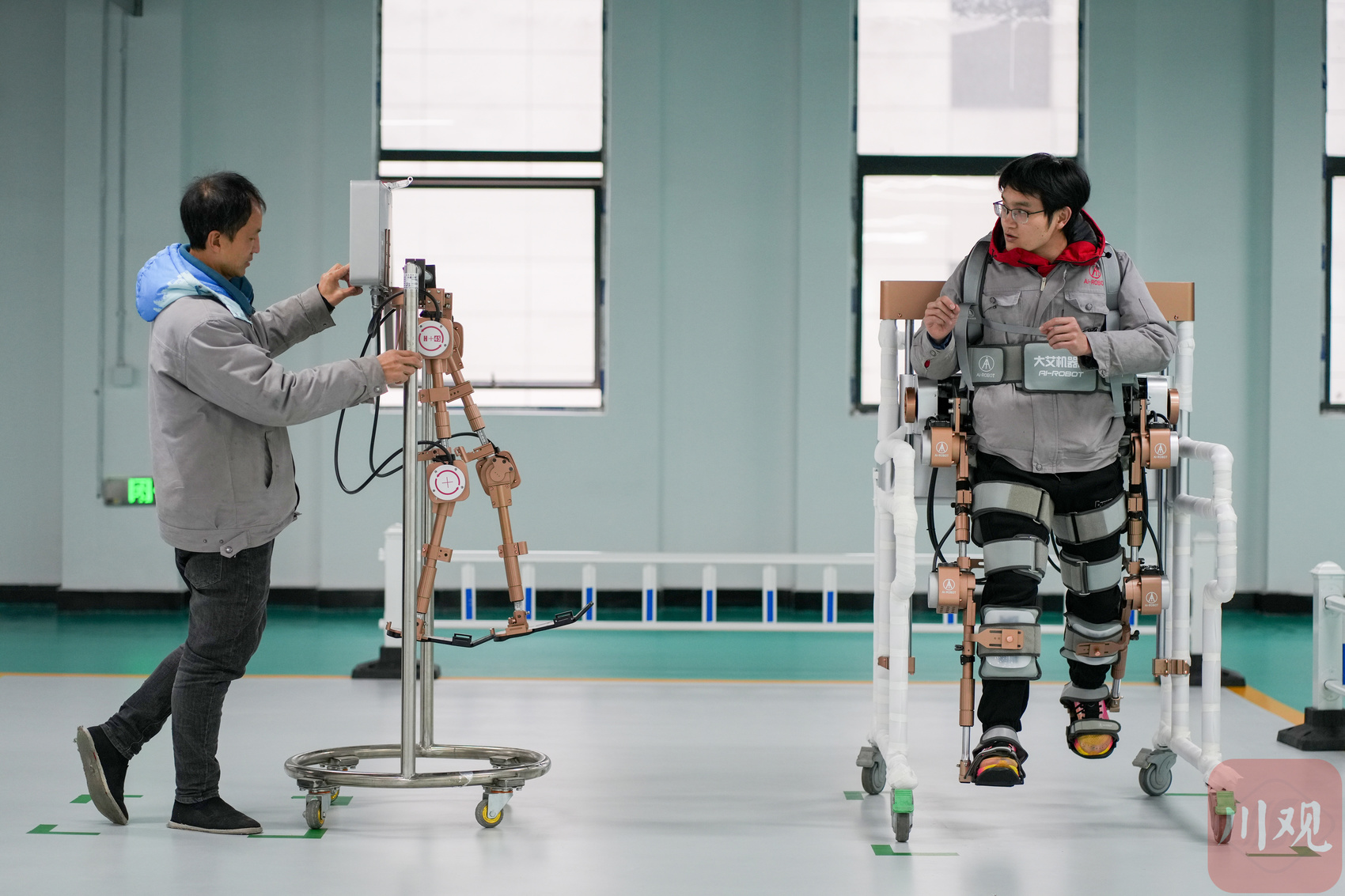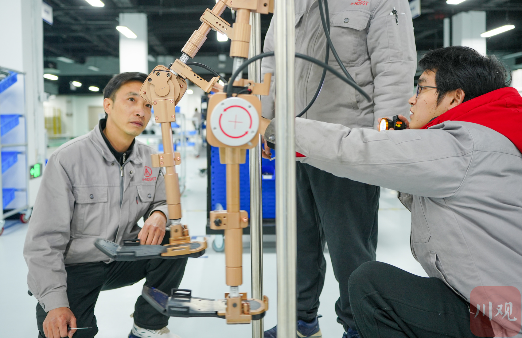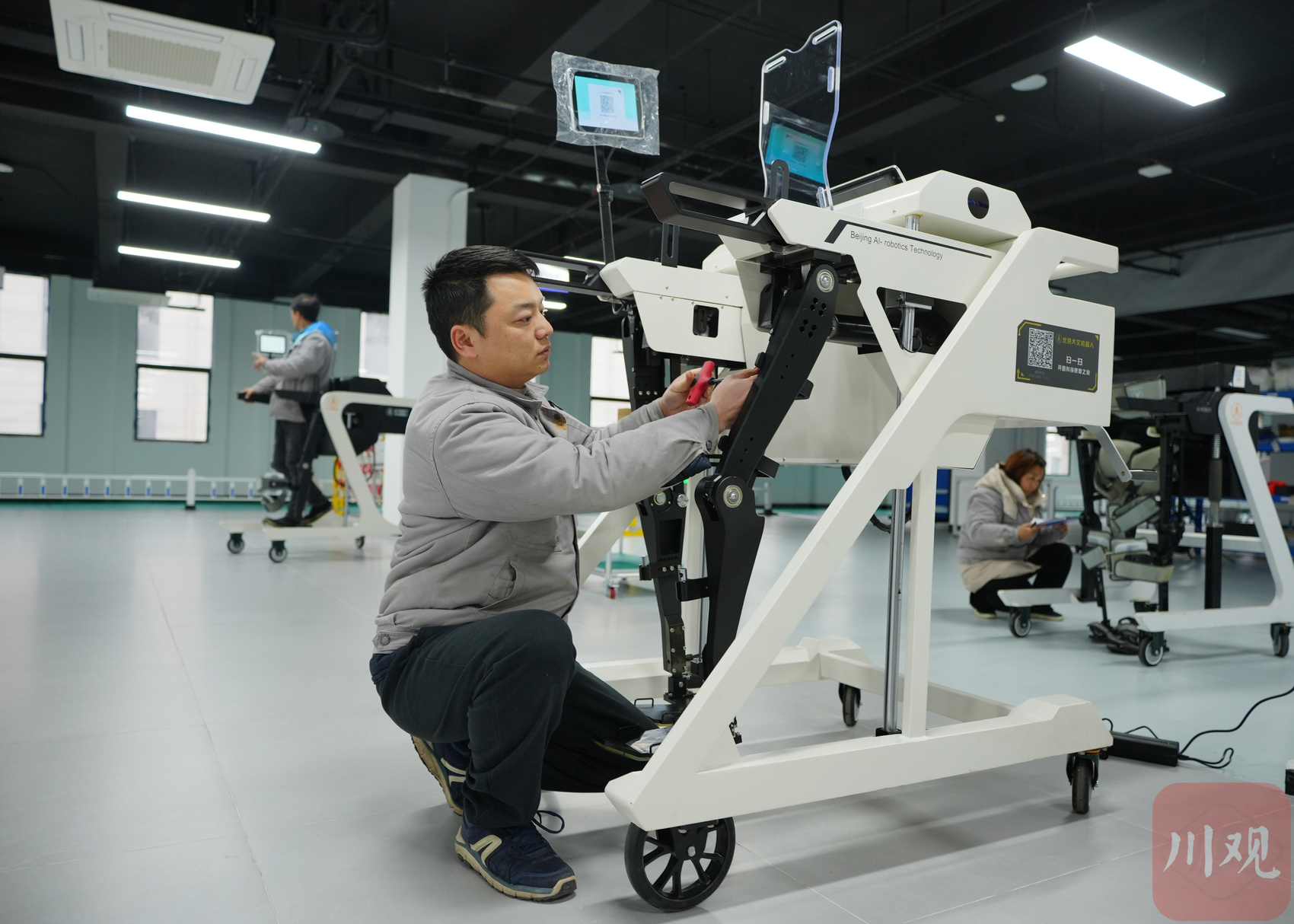 2月13日,四川泸州临港经济开发区,在四川行走科技有限公司车间里,工人们认真组装调试即将出厂的外骨骼康复医疗机器人。