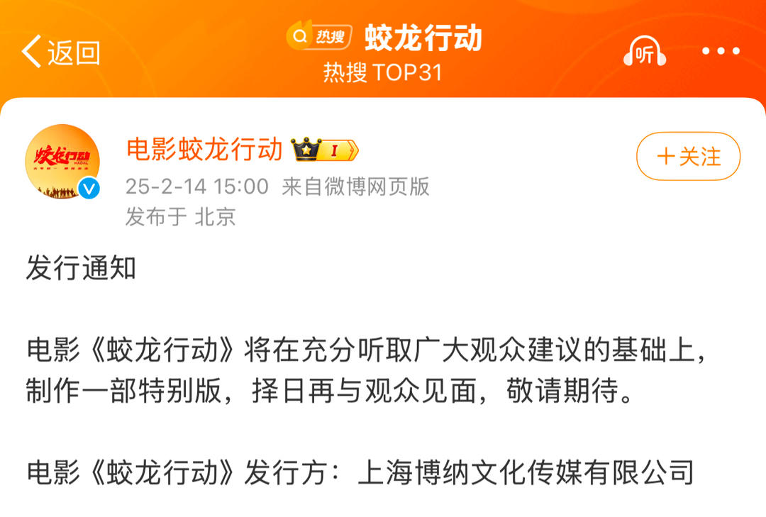 2月14日,由林超贤执导的军事动作片《蛟龙行动》官方微博发布声明,宣布将在充分听取观众建议的基础上制作一部特别版,择日与观众见面。而此前该片总制片人于冬曾多次强调“绝不撤档”,此番调整引发广泛讨论。