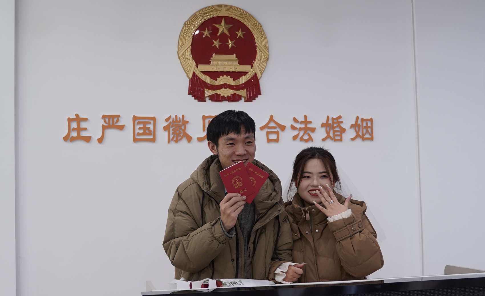 2月14日,领取结婚证的新人合影晒幸福。胡力文 摄