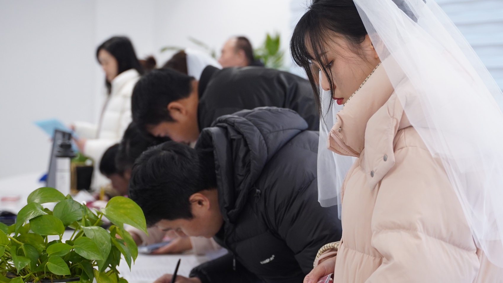 2月14日上午9点,广安市广安区民政局婚姻登记处,新人们在此办理婚姻登记、领取结婚证,共同许下爱的誓言。