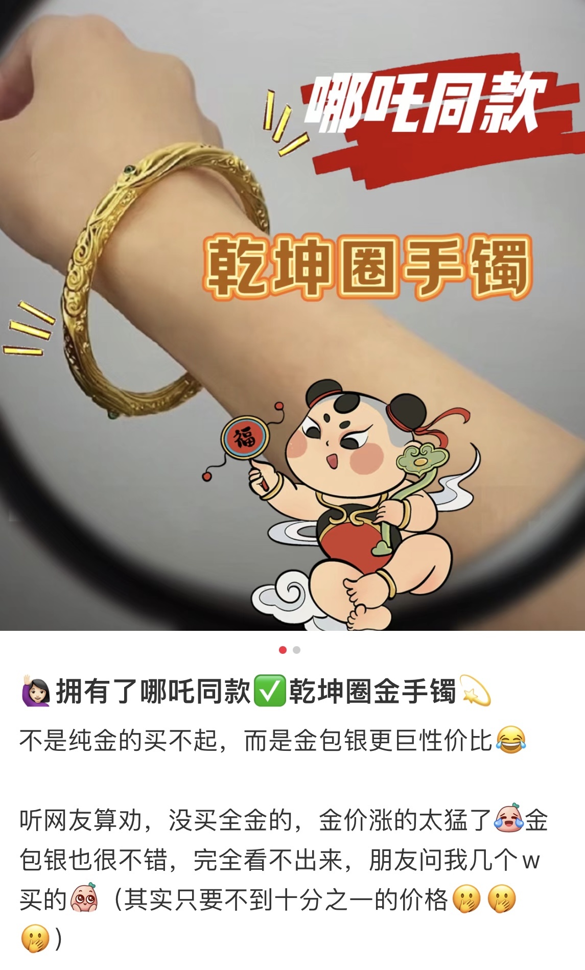 《哪吒2》的爆红让哪吒同款乾坤圈金镯子,成为当下“最贵”的热门周边产品。有网友测算,想要拥有一个哪吒同款的足金手镯,预估需要准备金重40至60克。按照现在的国际金价计算,这将至少花费2万余元。
