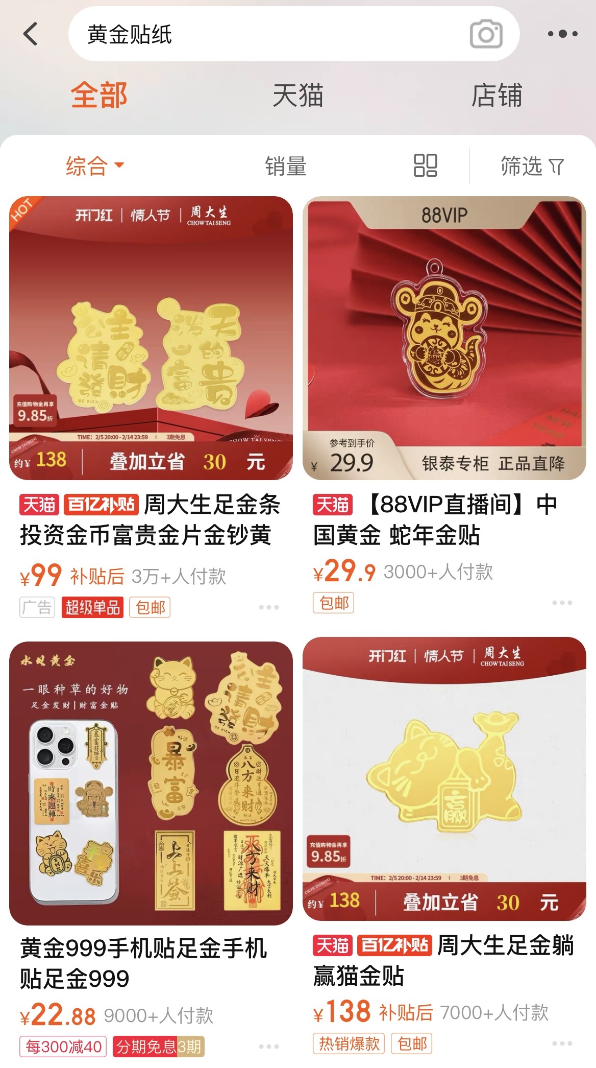 记者发现,市面上销售的黄金贴纸,大多都是由0.01克至0.2克左右的黄金制成,价格普遍在30元至200元之间。其中,周大生线上门店推出的一款99元黄金贴纸,目前销量也已超3万单。