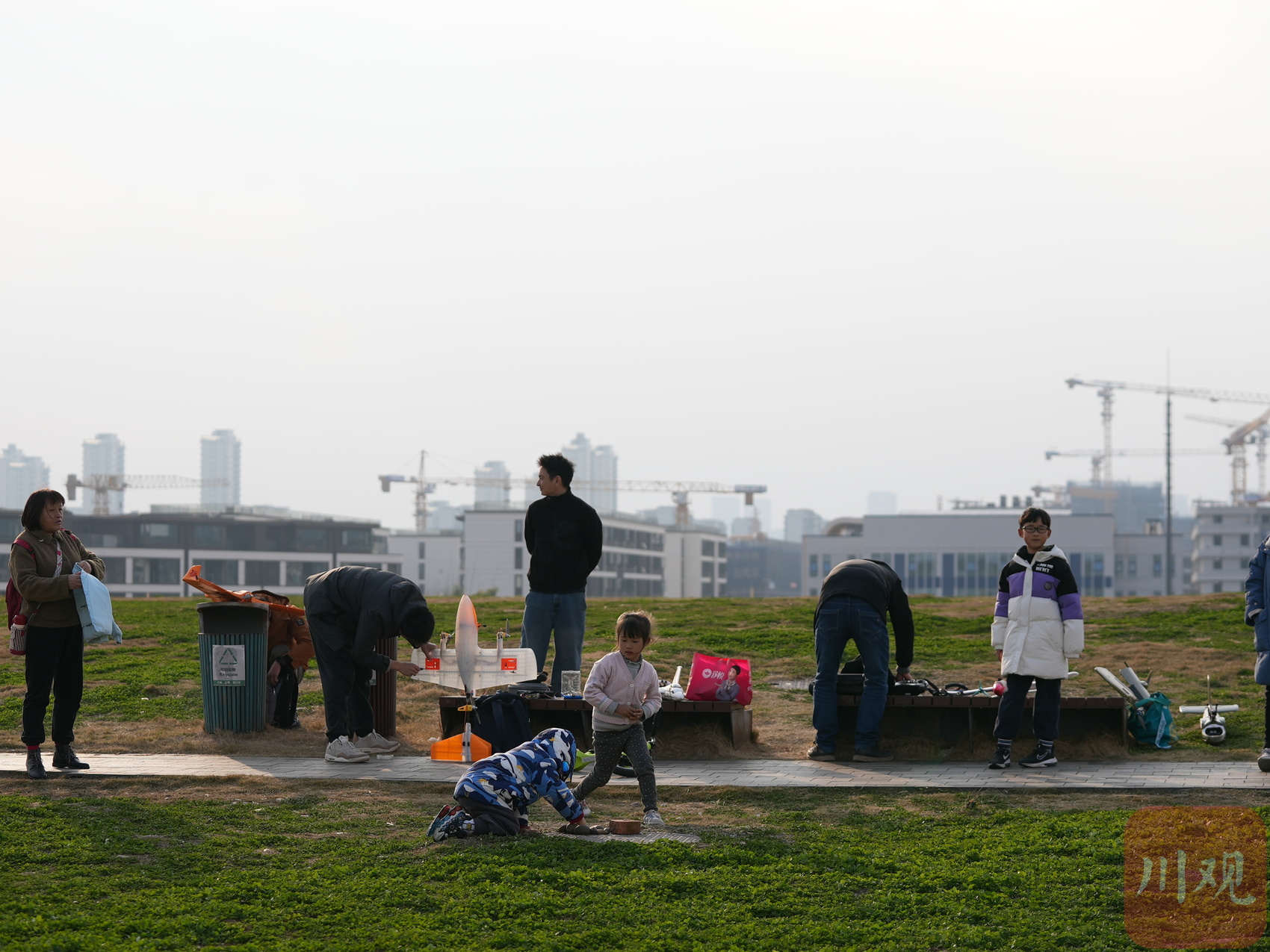 2月15日,成都市锦江区一公园的大草坪上,动力航模爱好者正在做起飞前的检查。