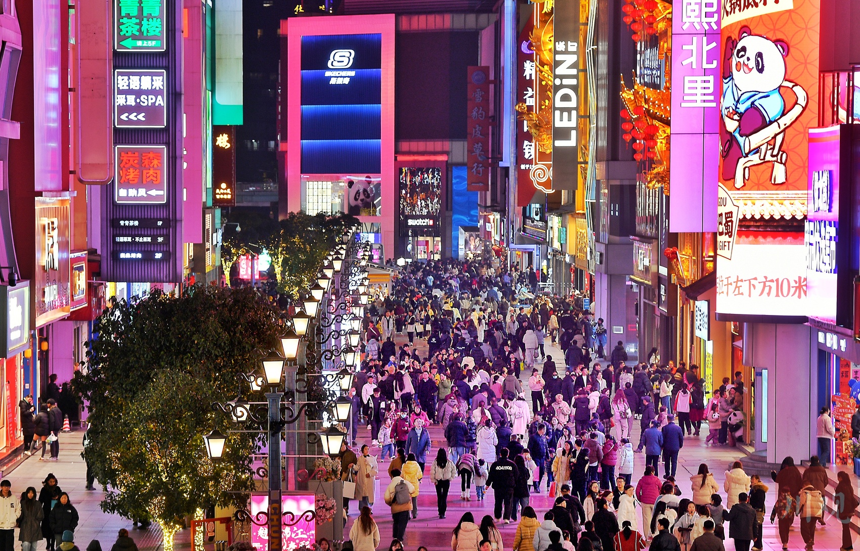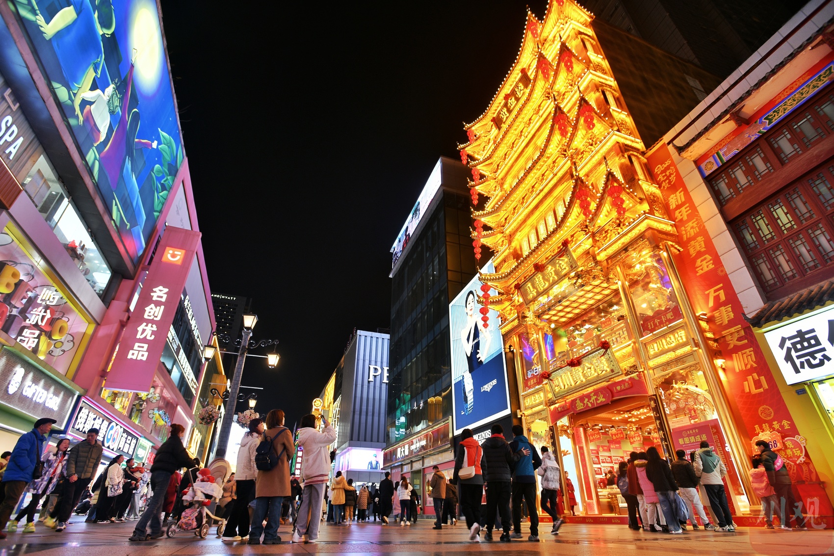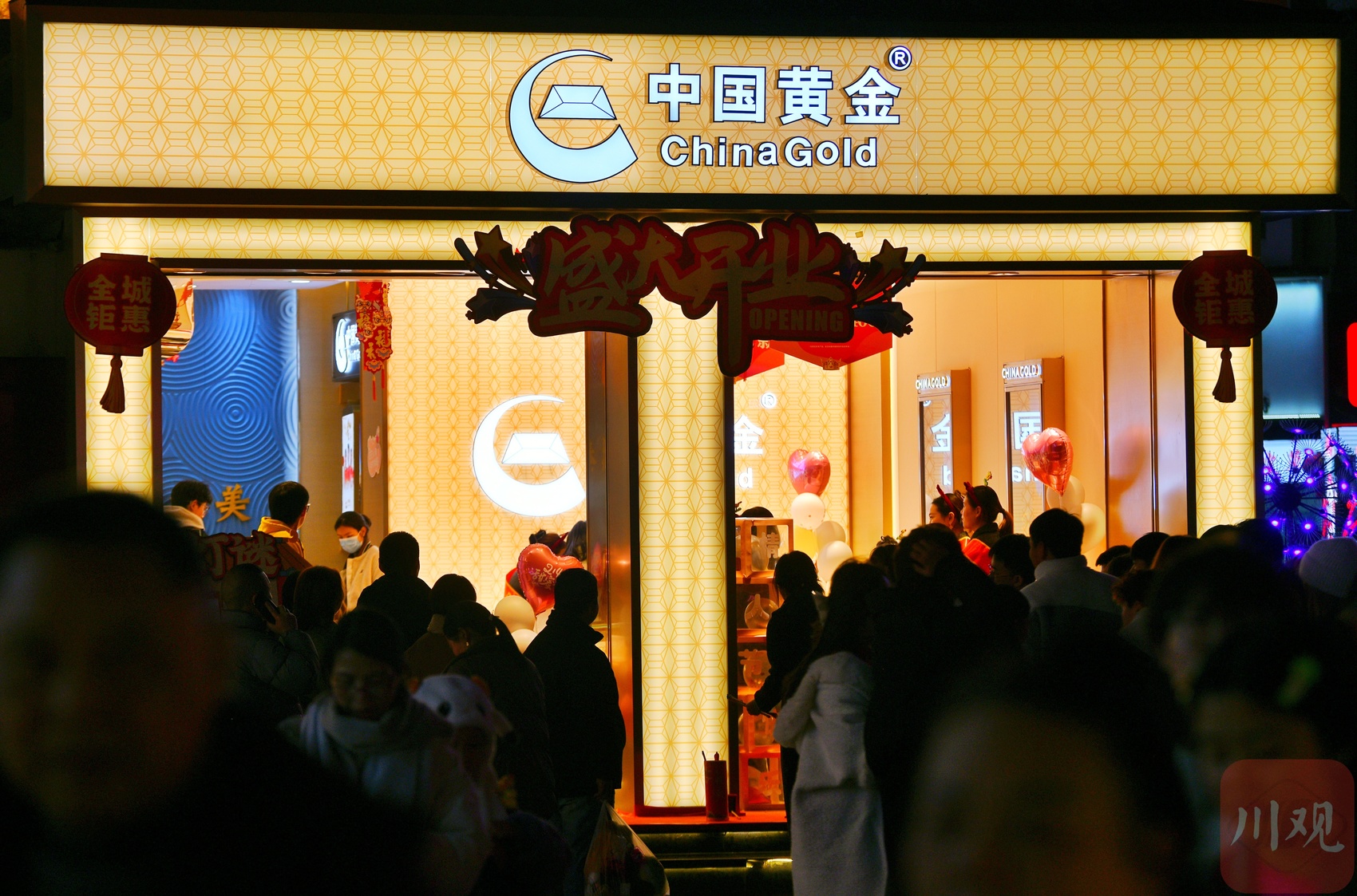 春节过后,黄金饰品生意持续火爆,尽管价格不断上涨,但消费者的热情丝毫未减。2月15日晚20点左右,记者在成都的百年春熙商业街看到,夜晚的春熙路依旧热闹非凡,霓虹闪烁的金店门庭若市,无论是老字号还是新店铺,进店选购、询价的顾客络绎不绝。为吸引消费者,各金店纷纷推出促销活动。在春熙路中段,一家金店以6层黄金楼造型示人,飞檐挑梁、金碧辉煌,二楼更有促销员装扮成各种潮人招揽生意,吸引路人驻足观望。