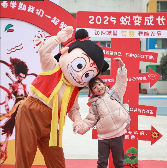 2月16日,成都双流协和实验小学迎来开学报到,“哪吒”现身与同学们热情互动,在写满祝福的合影板前留下欢乐瞬间。