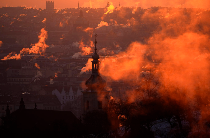 这是2月17日在捷克布拉格拍摄的朝阳升起时的景象。