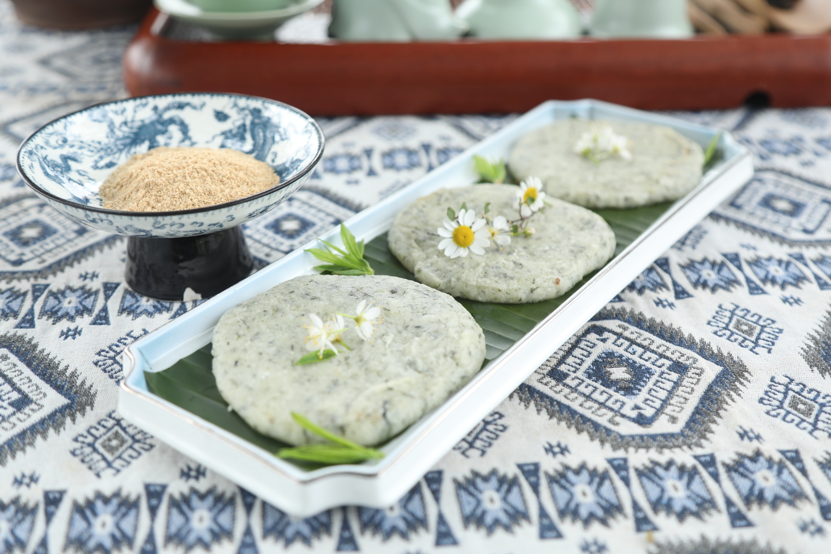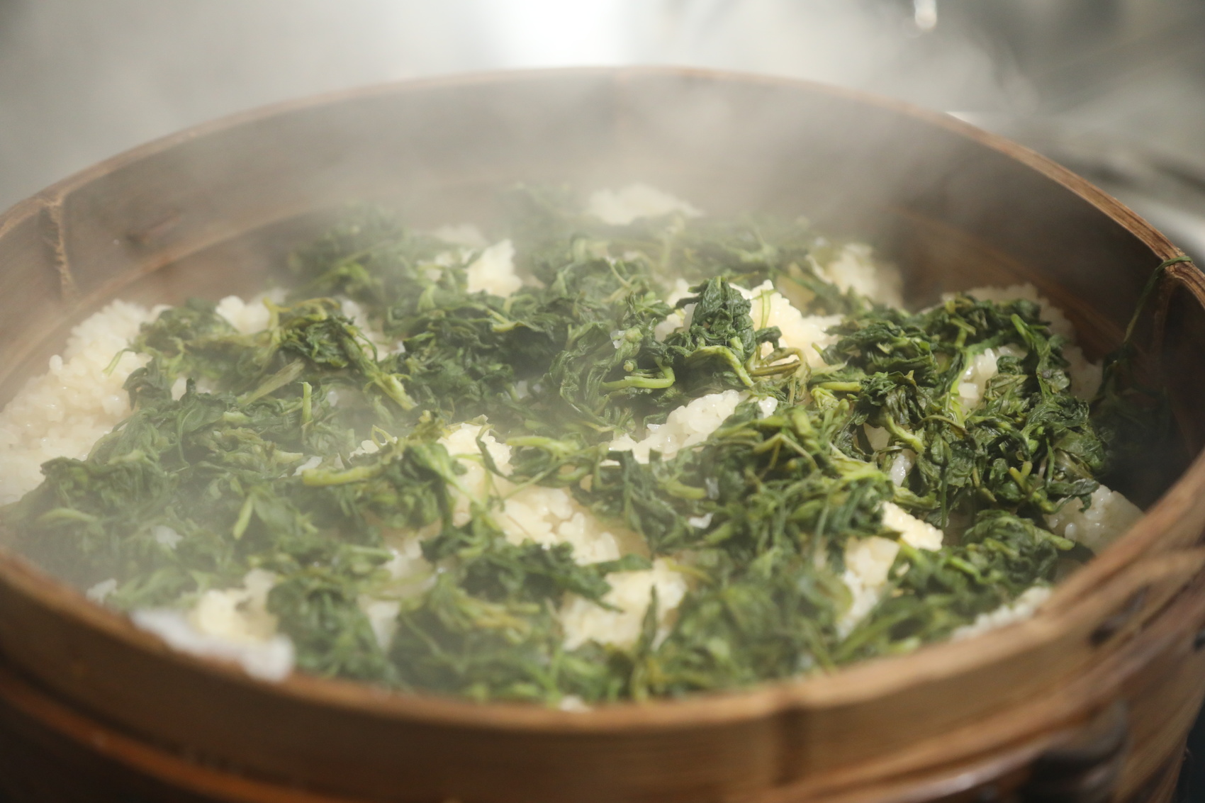 蒸、捣、揉、烙是软雀粑制作过程的四个必备步骤。据徐莉香介绍,制作软雀粑,首先,将采摘的新鲜软雀草洗净,与糯米一同放入甄子中蒸熟。蒸熟后,将热气腾腾的软雀草和糯米倒入石臼,用手工锤捣至黏稠的糊状。接着,将捣好的糊状物手工揉搓成团状,放在芭蕉叶上。最后,将揉好的软雀粑放入加热的铁锅中定型,香喷喷、软糯糯的软雀粑便出锅了,蘸上香甜的黄豆面,咬上一口,满口留香。