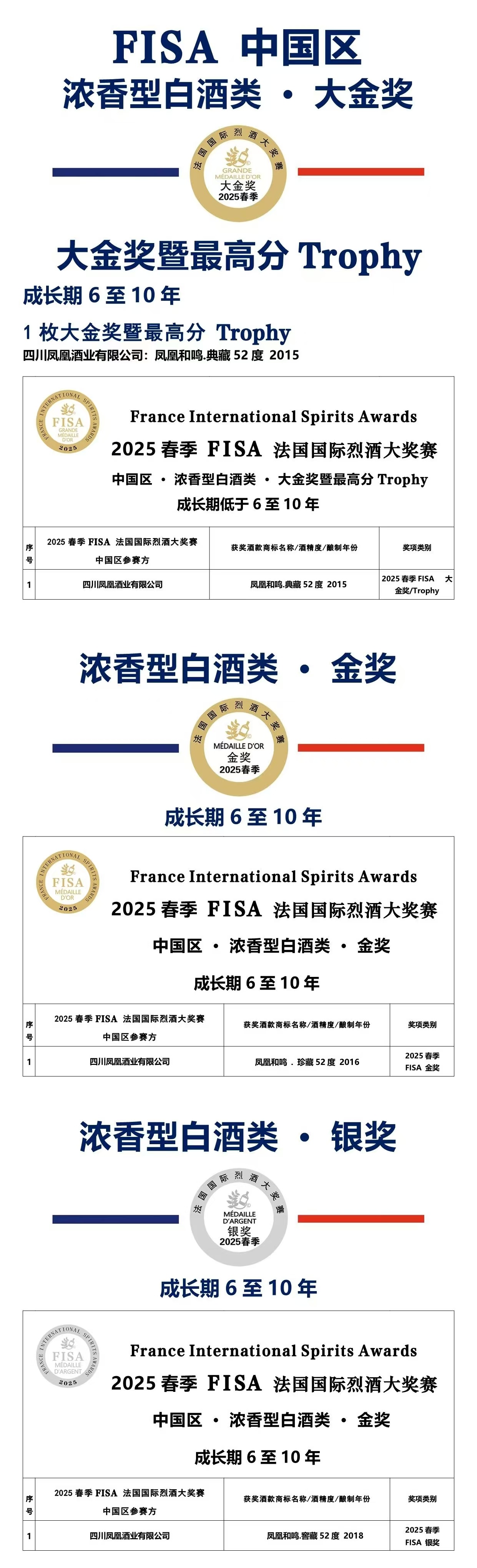 近日,2025春季FISA法国国际烈酒大奖赛(以下简称“FISA”)公布中国区获奖名单,白酒类共获13枚大金奖、10枚金奖、7枚银奖。其中,四川凤凰酒业有限公司(以下简称“凤凰酒业”)的凤凰和鸣·典藏52度2015、凤凰和鸣·珍藏52度2016、凤凰和鸣·窖藏52度2018,分获浓香型白酒类(成长期6至10年)大金奖、金奖和银奖。