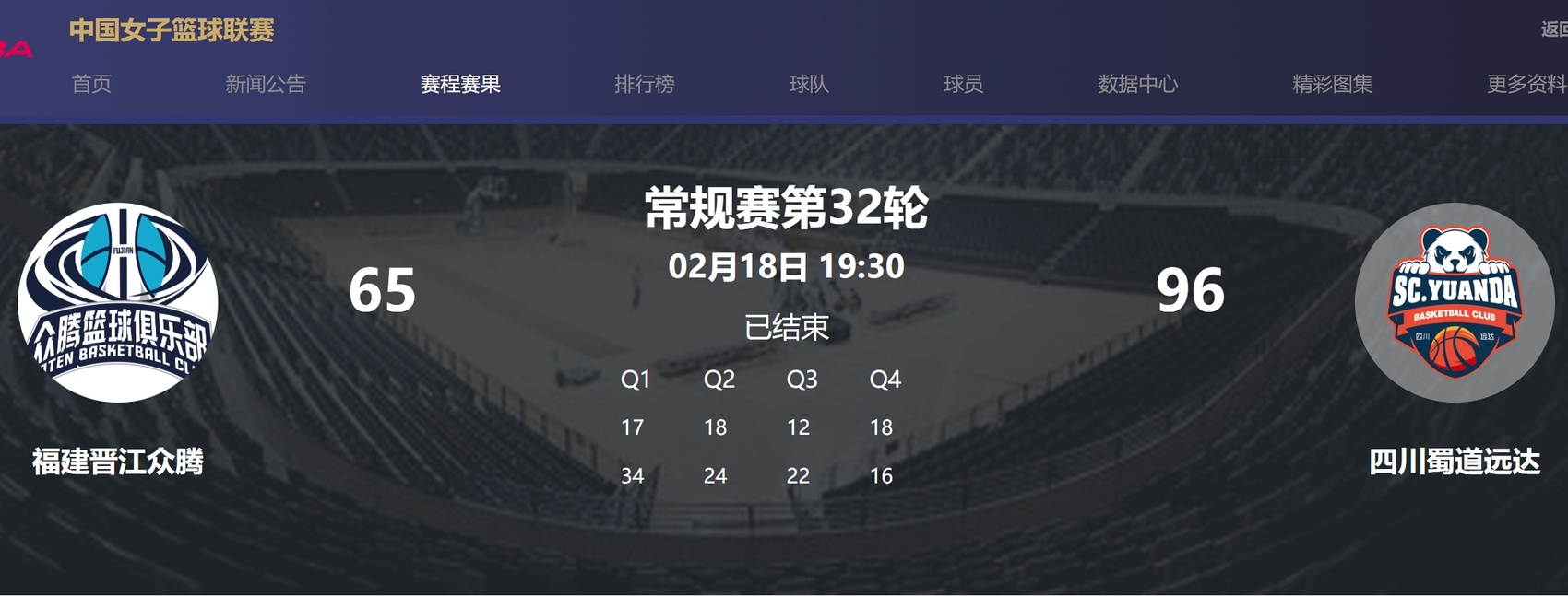 2月18日晚,2024—2025赛季WCBA(中国女子篮球联赛)常规赛进入收官战。在福建晋江市工人文化宫篮球馆,四川蜀道远达女篮来到客场,与福建晋江众腾女篮交锋,最终以96:65战胜对手,以31胜1负的骄人战绩加冕常规赛第一。