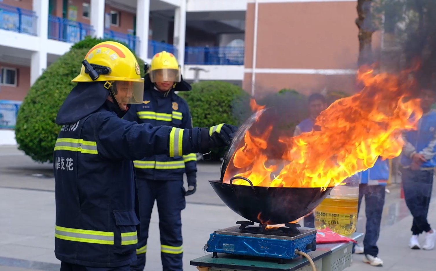 学校老师身着消防战斗服,用锅盖盖灭油锅起火。