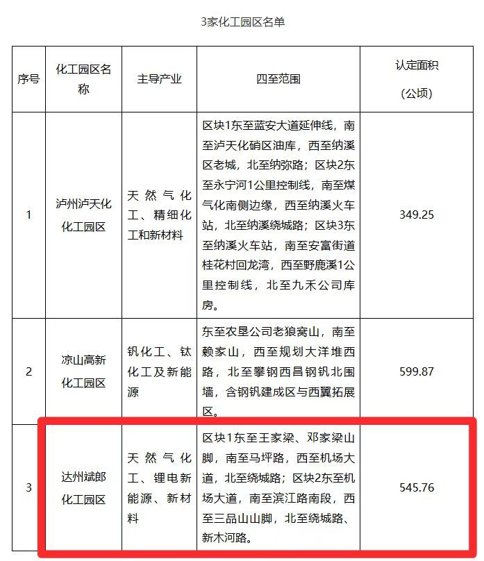 2月19日,四川省经济和信息化厅网站发布通知,近日,四川省经济和信息化厅等6部门公布了新认定的3家化工园区名单,达州斌郎化工园区在列。