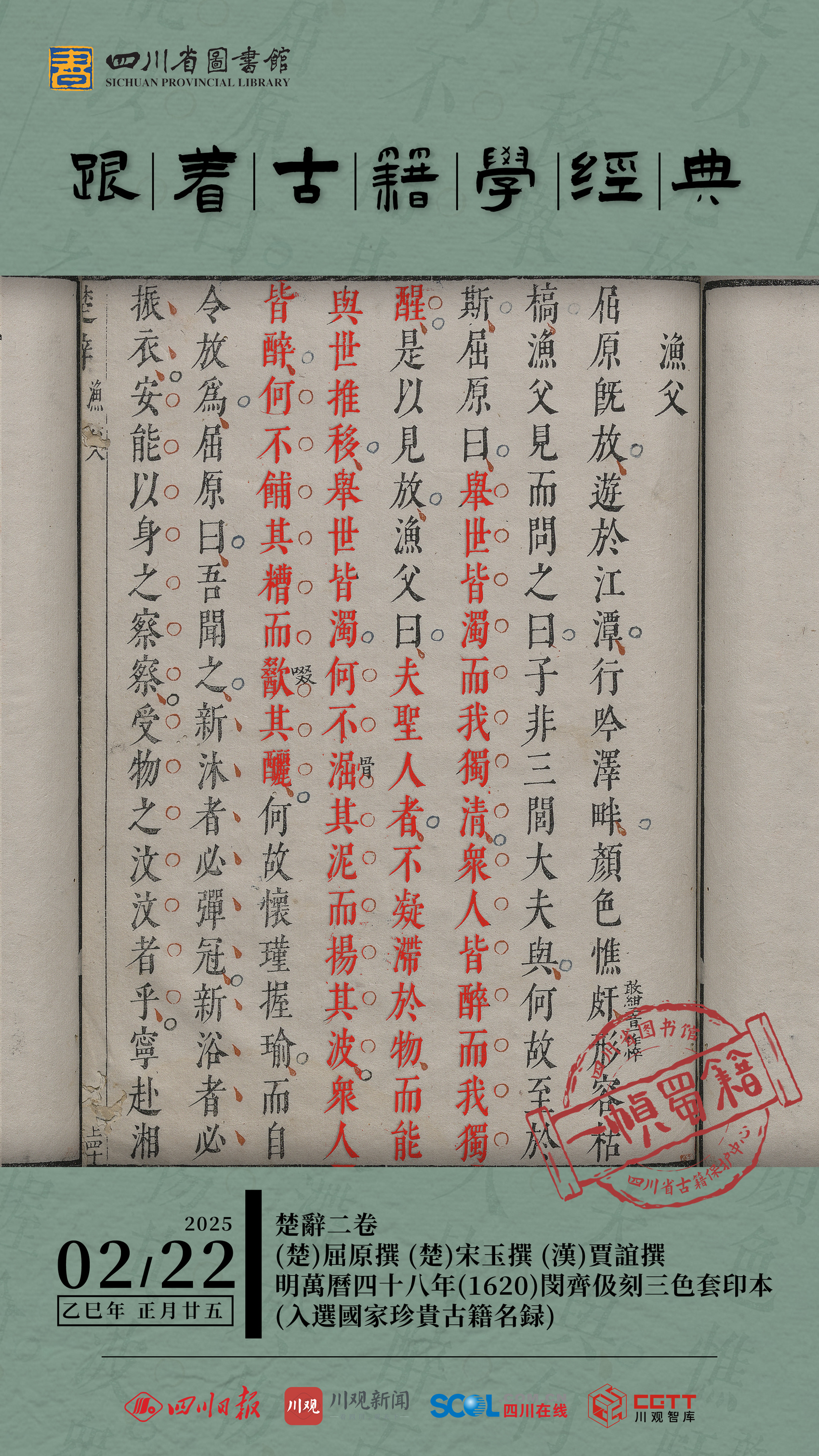 2月22日,一帧蜀籍带您走进《楚辞》。海报所选用图源于《楚辞》二卷,(楚)屈原撰(楚)宋玉撰(汉)贾谊撰,明万历四十八年(1620)闵齐伋刻三色套印本。(入选国家珍贵古籍名录)