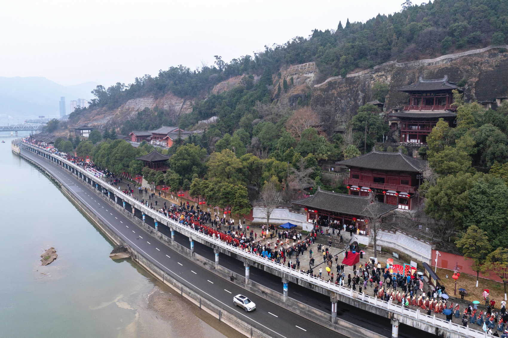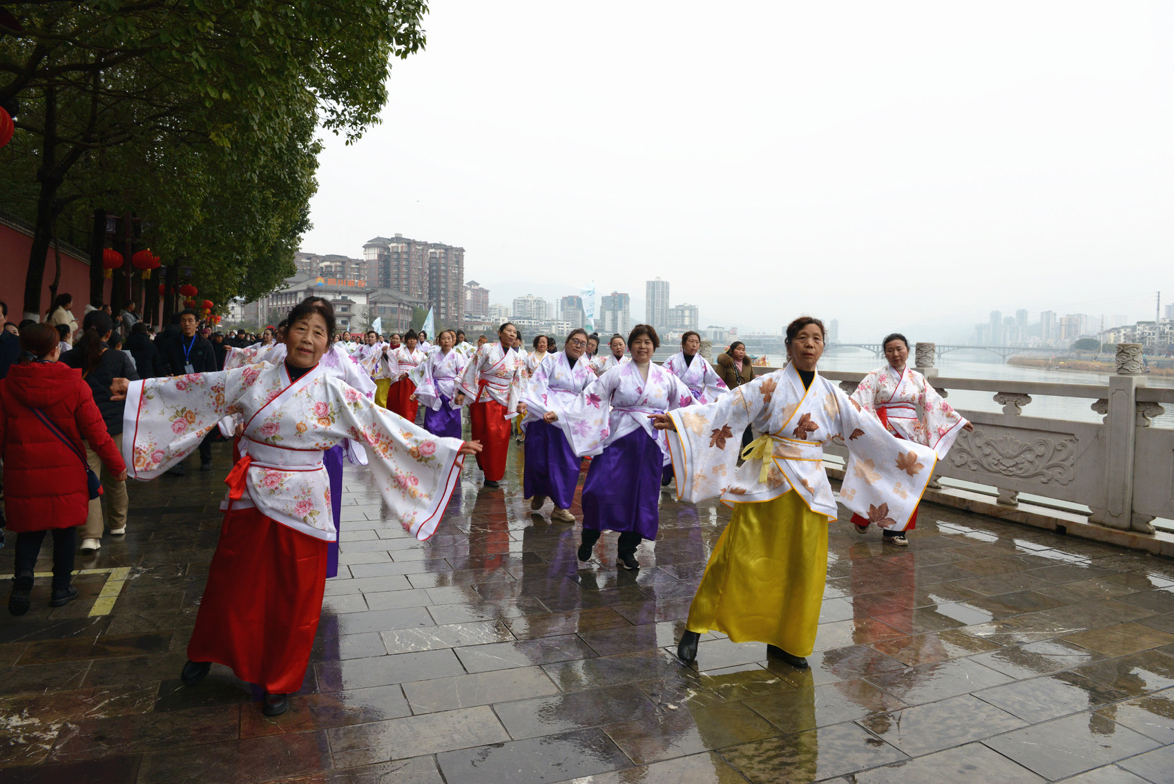 2月20日,在广元市利州区嘉陵江两岸(皇泽寺到凤翔楼沿途),百名身着唐风汉服领舞人员和前来游玩的群众共同欢乐踏歌,以一曲《女儿河》为“正月二十三·女儿游河湾”群众文化惠民活动增添了一抹绚丽的传统文化色彩。