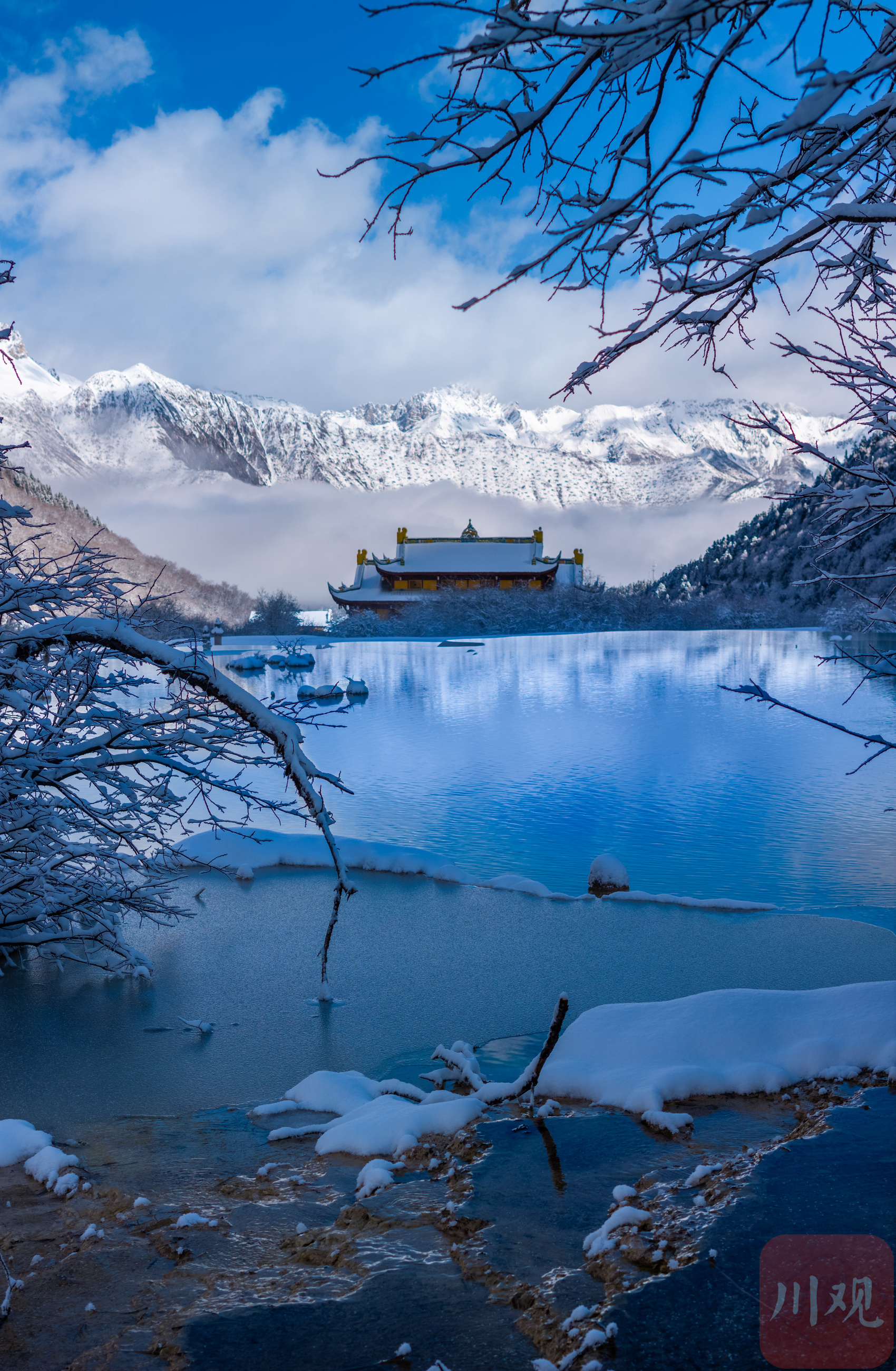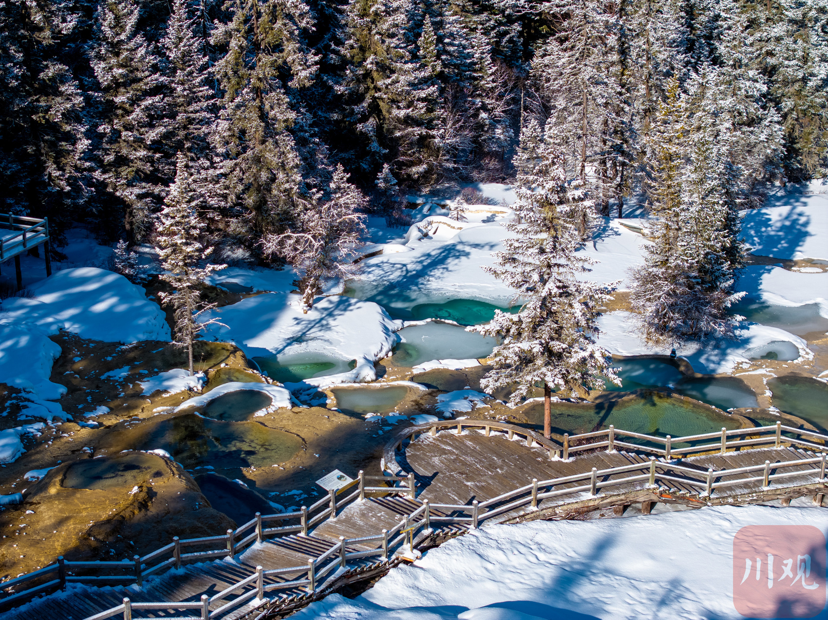 2月20日,大雪覆盖了黄龙景区全部范围,彩池在白雪映衬下更显青绿,还有四周栈道、原始森林、钙华、瀑布、古寺,积雪后呈现另一番动人景象。晶莹剔透的冰花,与四周涌动的春天气息形成特别的画卷,蓝绿、明黄、浅白等颜色相互交织,仿佛是大自然的调色盘。