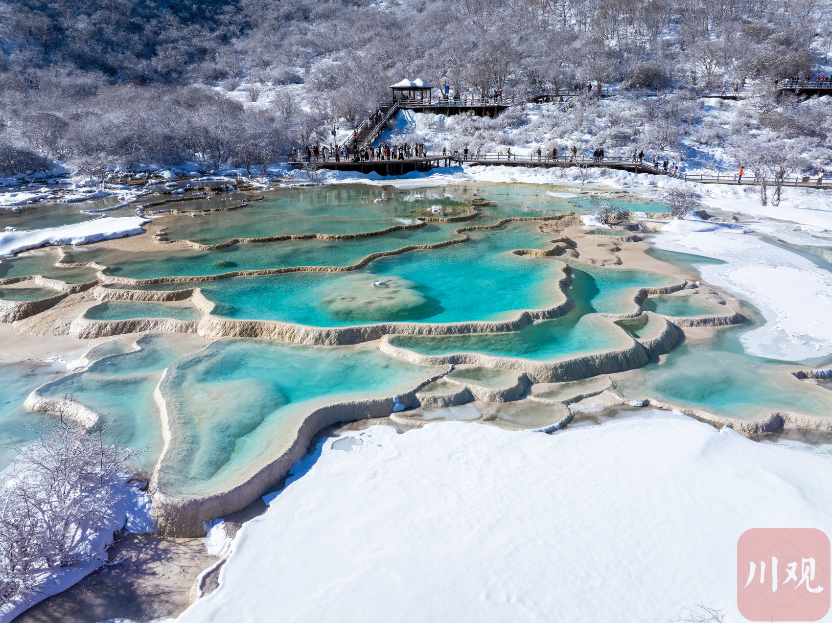 2月20日,大雪覆盖了黄龙景区,彩池在白雪映衬下更显青绿。