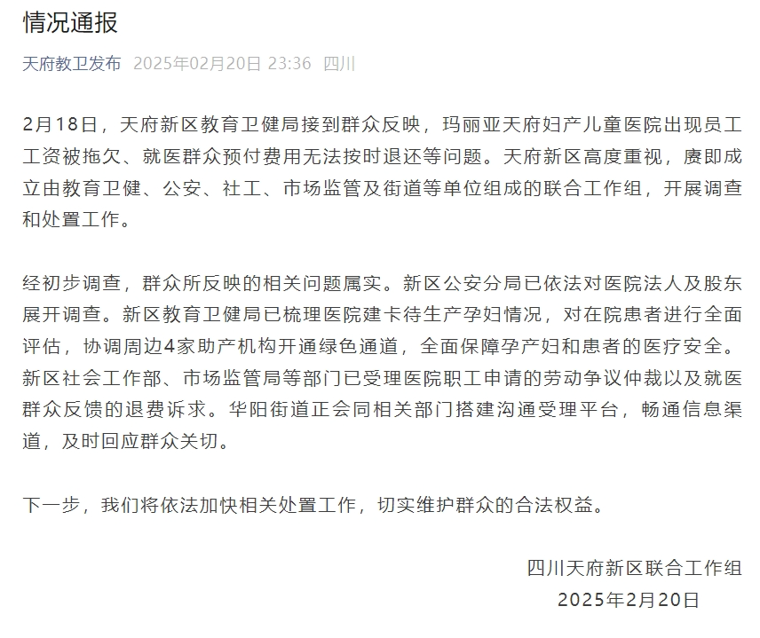 2月18日,天府新区教育卫健局接到群众反映,玛丽亚天府妇产儿童医院出现员工工资被拖欠、就医群众预付费用无法按时退还等问题。天府新区高度重视,赓即成立由教育卫健、公安、社工、市场监管及街道等单位组成的联合工作组,开展调查和处置工作。