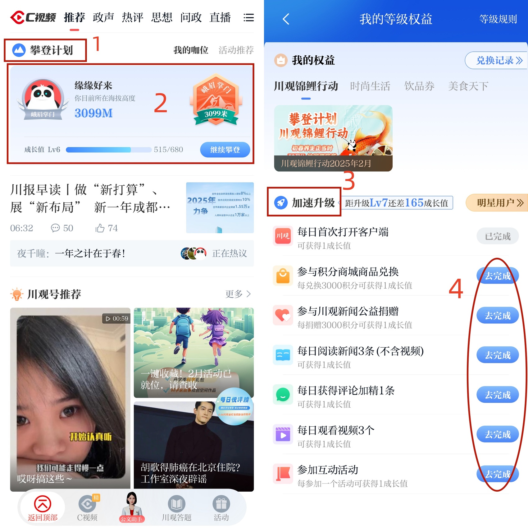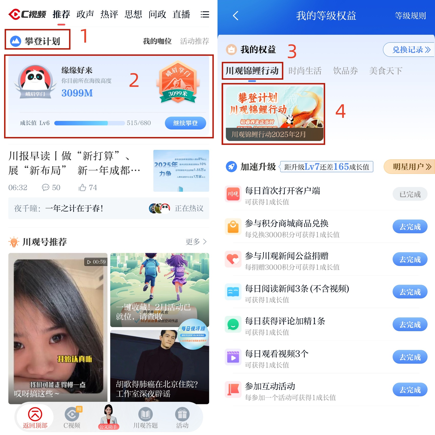 2、在川观新闻首页,点击“攀登计划”—“我的权益”,找到“川观锦鲤行动2025年2月”活动图片,根据提示参与抽奖。