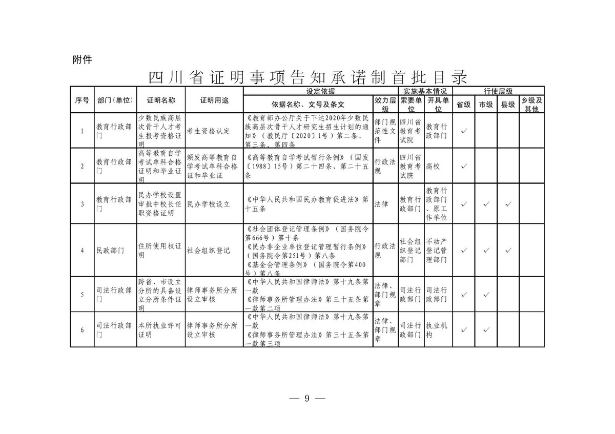 近日,省政府办公厅印发《四川省全面推行证明事项告知承诺制实施方案》,(以下简称《方案》),要求各地各部门(单位)针对办理行政许可、行政确认、行政给付等依申请的行政事项开展全面推行证明事项告知承诺制,推动形成标准公开、规则公平、预期合理、各负其责、信用监管的治理模式,进一步从制度层面方便企业和群众办事创业,平稳有序推行证明事项告知承诺制。