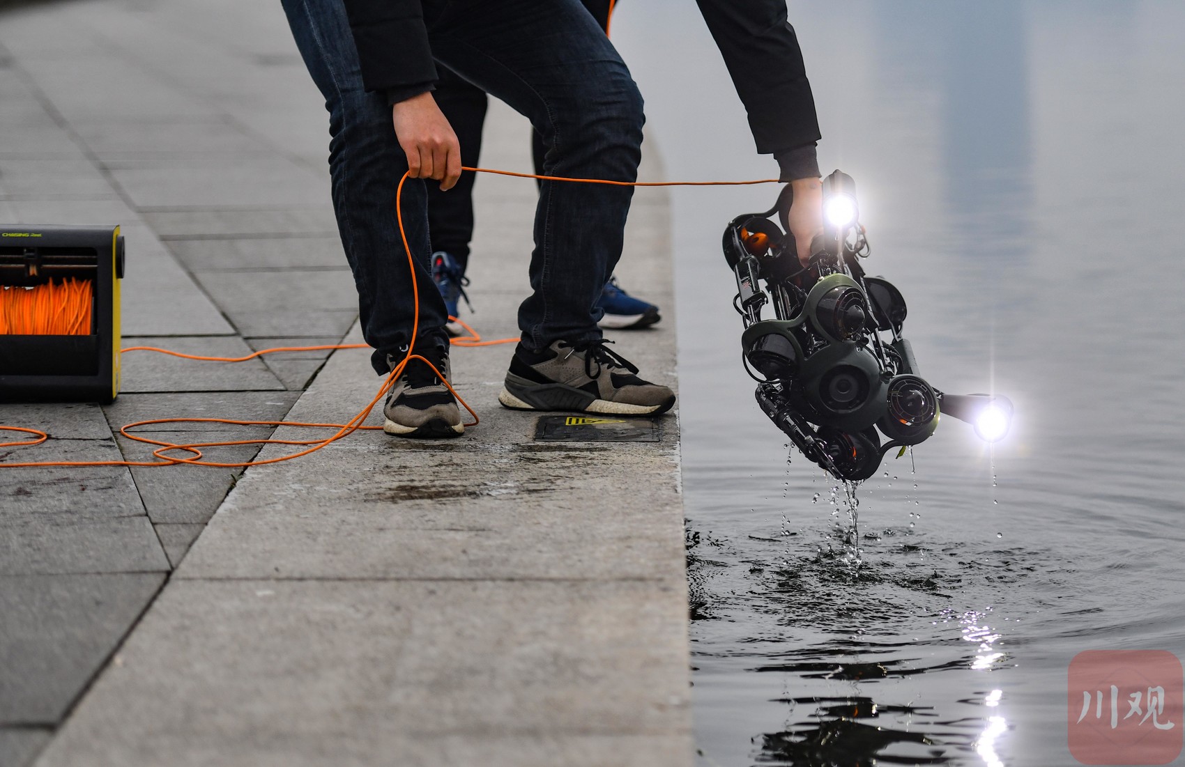2月21日,四川天府新区潜行创新(成都)机器人科技有限公司工作人员在训练水下机器人设备——潜鲛P200 PRO行业级水下机器人,它可下潜200米执行多种任务。