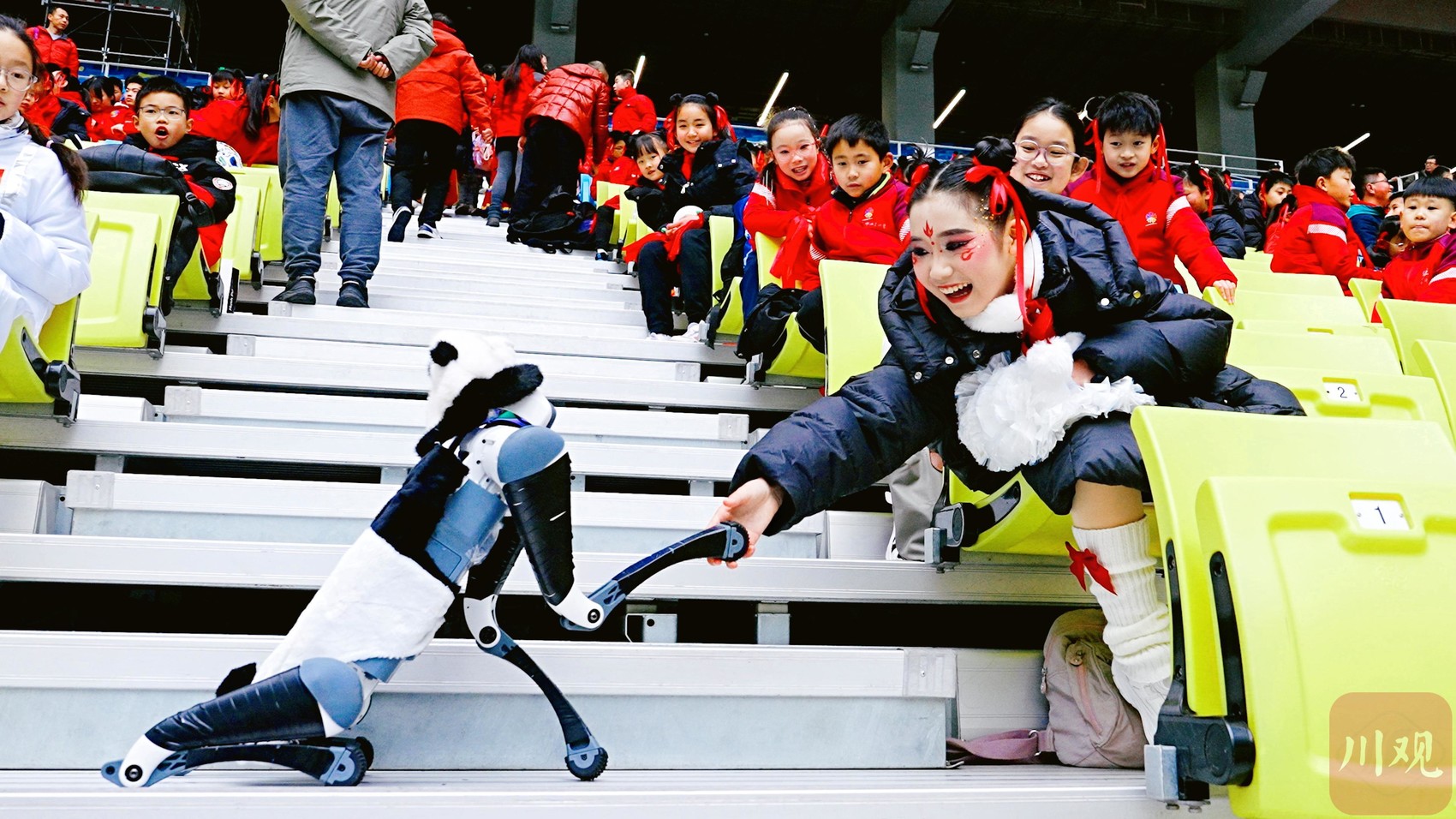 2月22日,四川具身科技研发的四足“熊猫”机器人化身啦啦队,在成都凤凰山体育场为2025赛季中超联赛加油鼓劲。