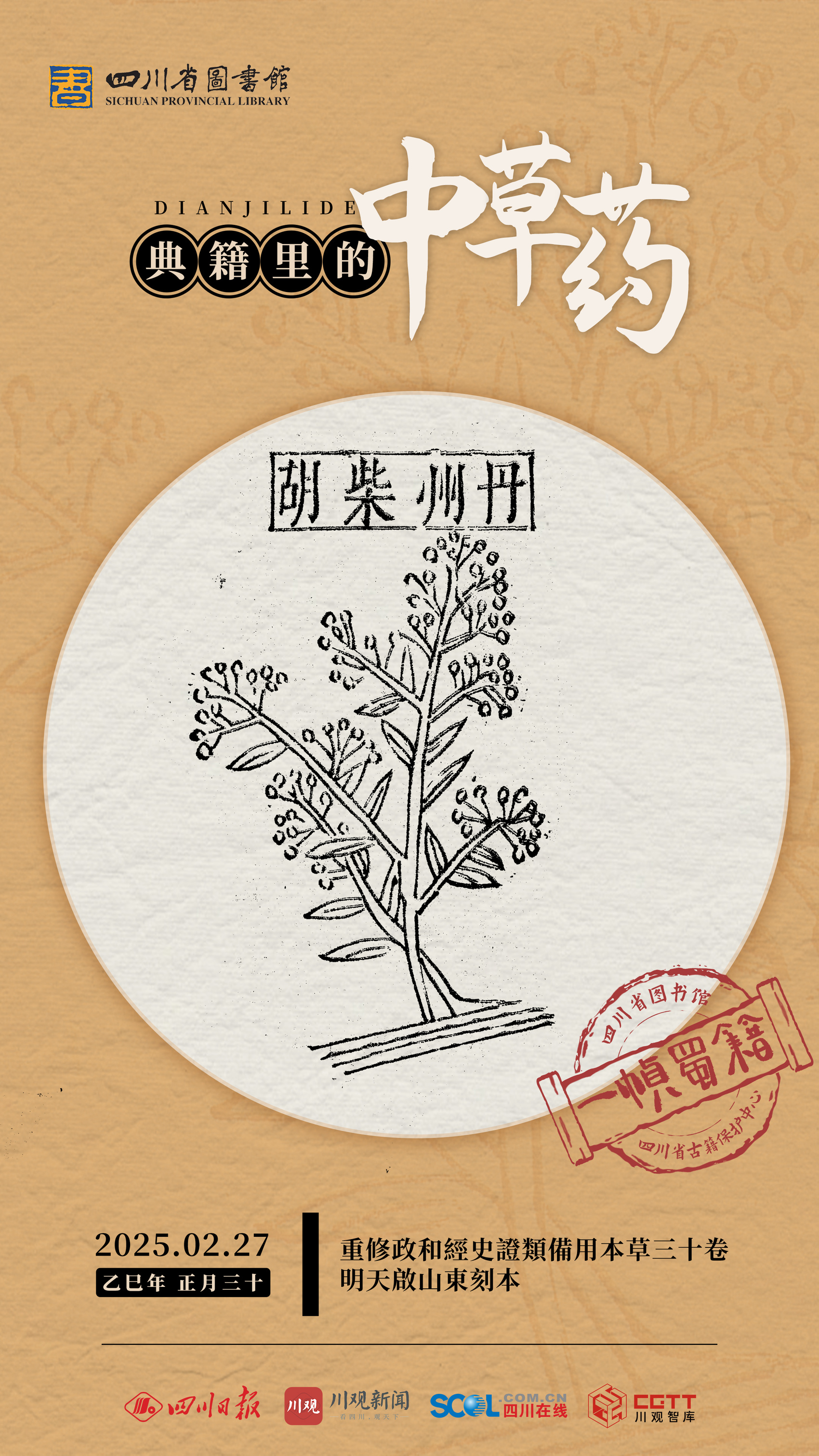 2月27日,一帧蜀籍带您走进《重修政和经史证类备用本草》。海报所选用图源于《重修政和经史证类备用本草》三十卷,明天启山东刻本。