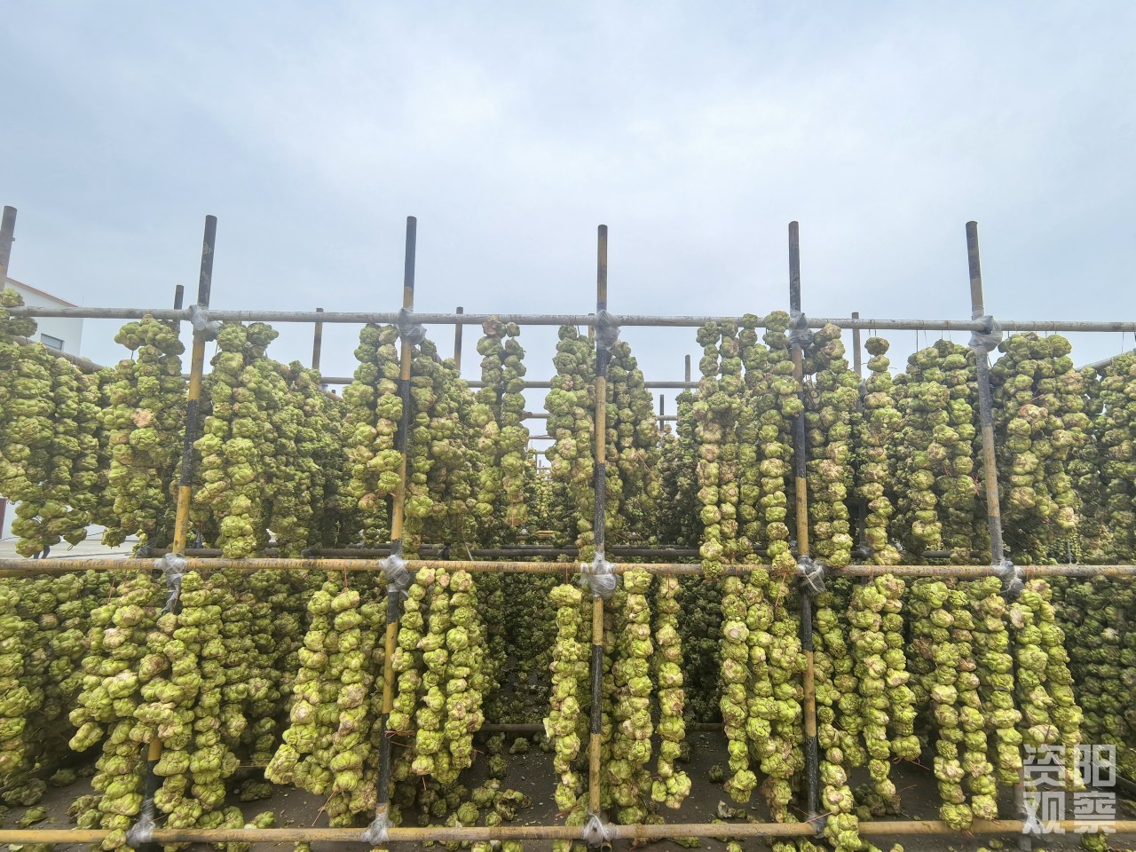 8分钟后,范利凯到达目的地,称重后将其送往工厂晒坝,紧接着工人们进行初筛后,再将大小合适的榨菜穿成一串挂在架子上风干。记者走进企业生产车间参观通道,浓郁的榨菜香味扑面而来。车间内,数十名工人身着统一的白色工作服,忙碌在各自的生产线上。