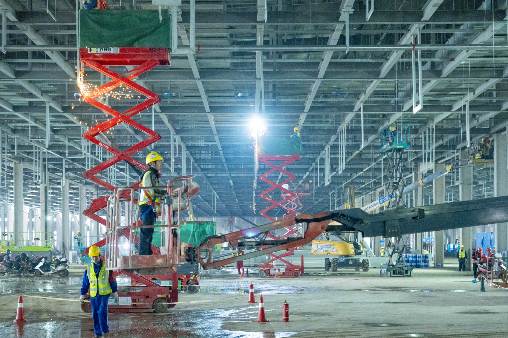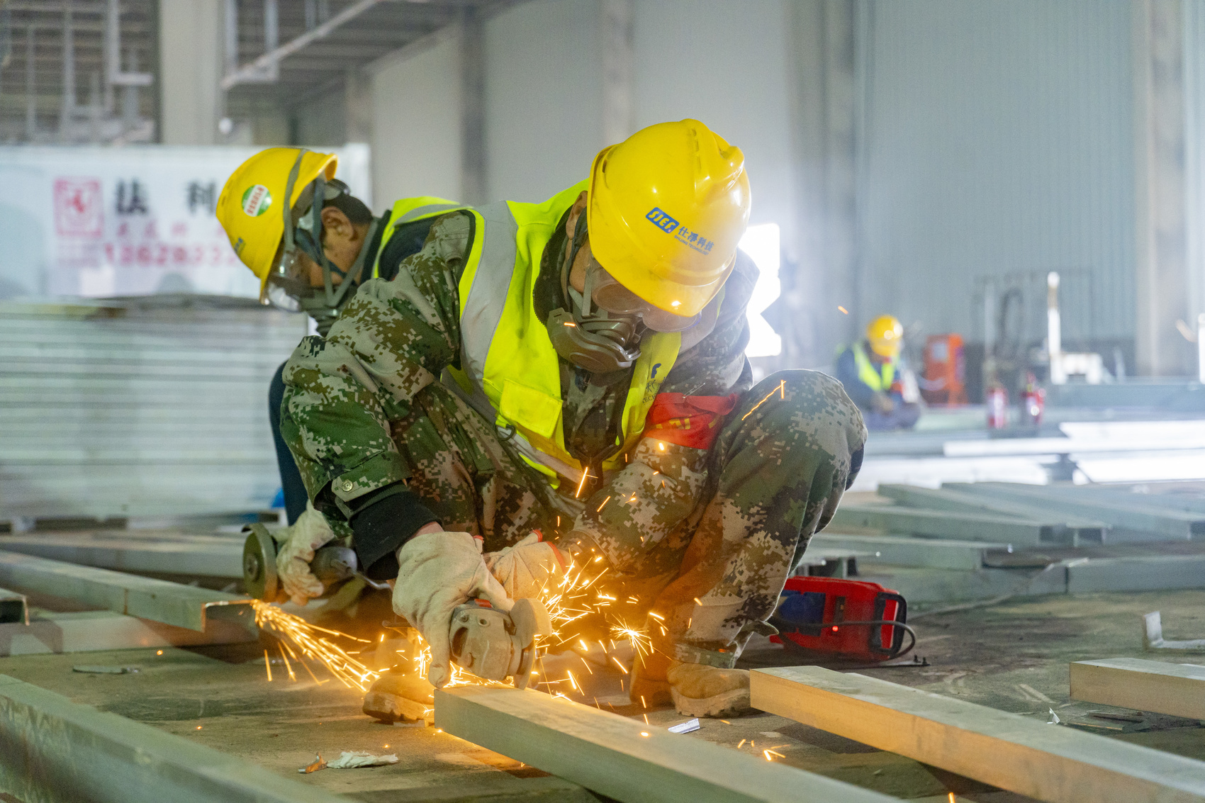 作为项目核心的一期厂房,施工正如火如荼推进。记者在现场看到,十余台红色剪叉车在钢架间升降穿梭,300余名身着绿色反光背心的工人们正在不同作业面忙碌,钢材焊接的蓝色火花不时闪现,发出的“嗞嗞”声此起彼伏。