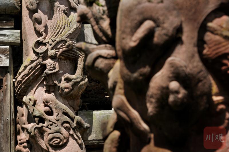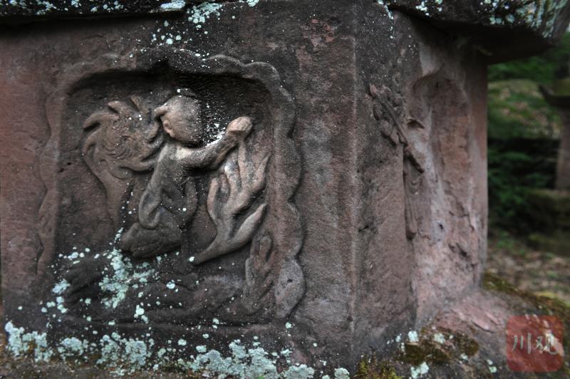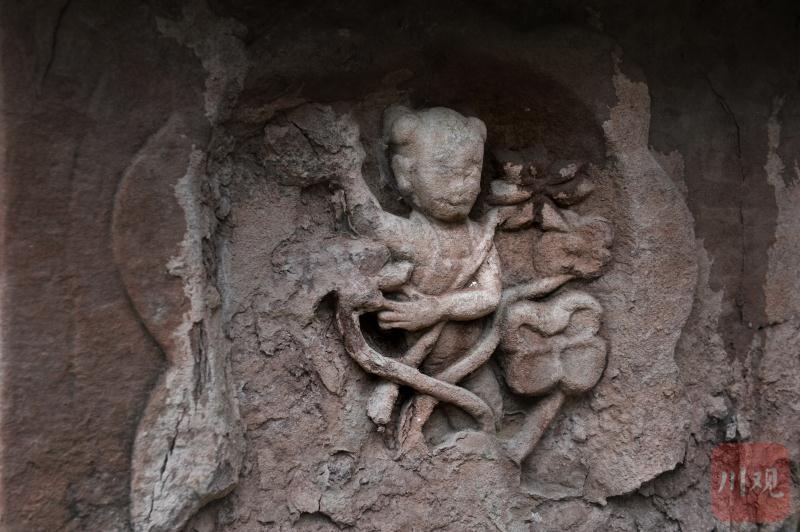泸州合江县尧坝白云寺内,和尚塔上的哪吒浮雕以栩栩如生之态,诉说古老传说。
