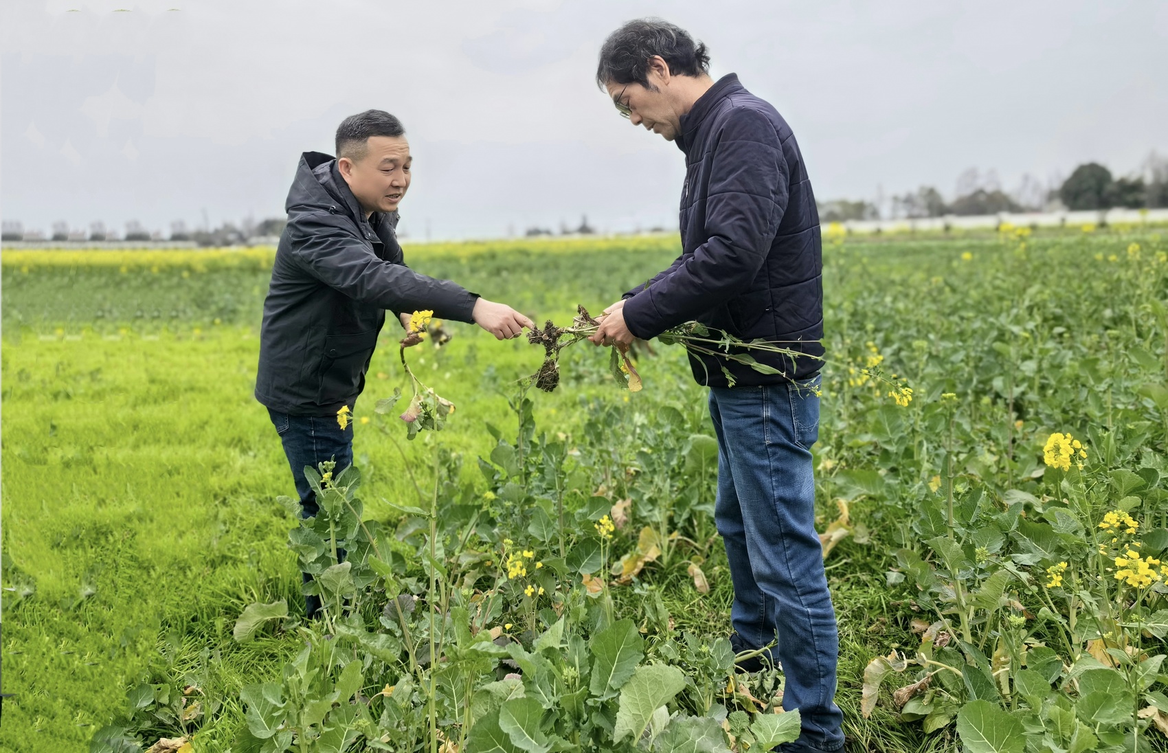 葛乃勇(左一)与省农科院植保所二级研究员刘勇(右一)探究油菜种衣剂对根肿病的防治效果。