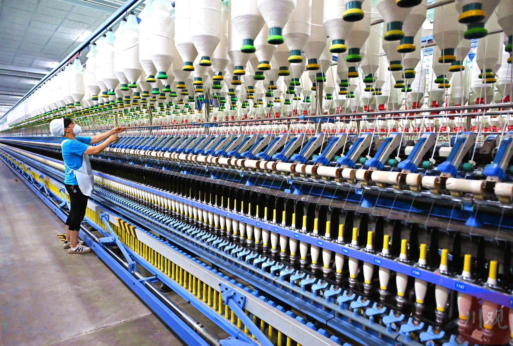 在眉山市仁寿县金鹅纺织有限公司,工人正在生产线上赶制订单。潘帅/摄