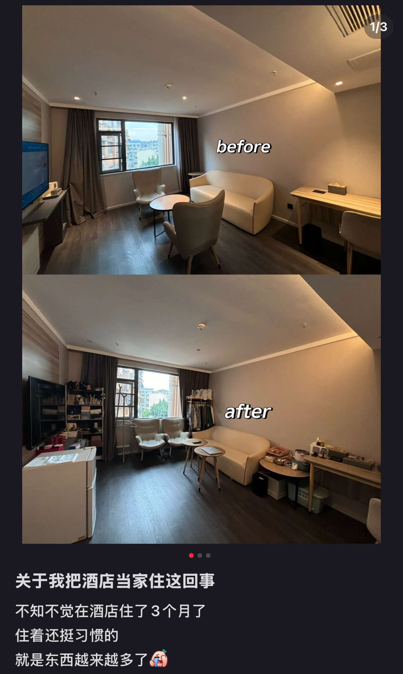 年轻人中意长租酒店,无非是想用短期合约换来喘息空间,以极简主义应对不确定性,也算不错的选择~缺点就是酒店不能做饭,生活少了点烟火气,也许对于这届年轻人来说,这些都没那么重要