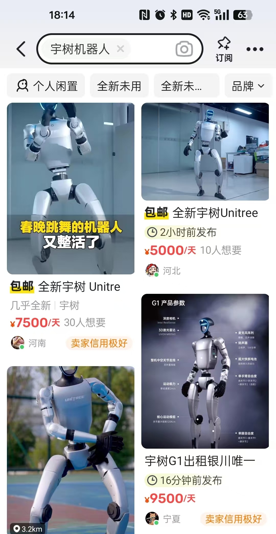在二手交易平台,宇树机器人G1的日租金在5000至9500元之间,春晚同款的H1机器人日租金显示在5万至6万元左右,即使价格如此昂贵,仍然有不少客户表示想要。