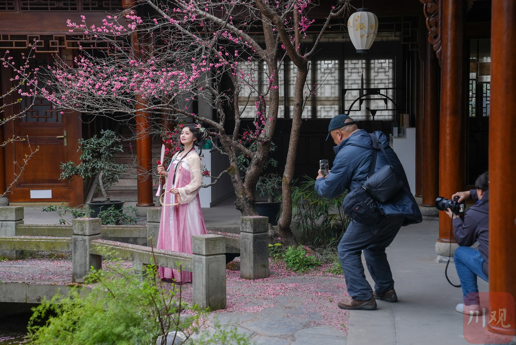 千姿百态的川派盆景再配上海棠花、梅花争奇斗艳,两位汉服爱好者穿梭其间,宛如一幅水墨画,吸引了摄影家们驻足创作。大家不停选取角度、按下快门,不忍错过任何一幅兼具审美价值和观赏效果的精美画卷。