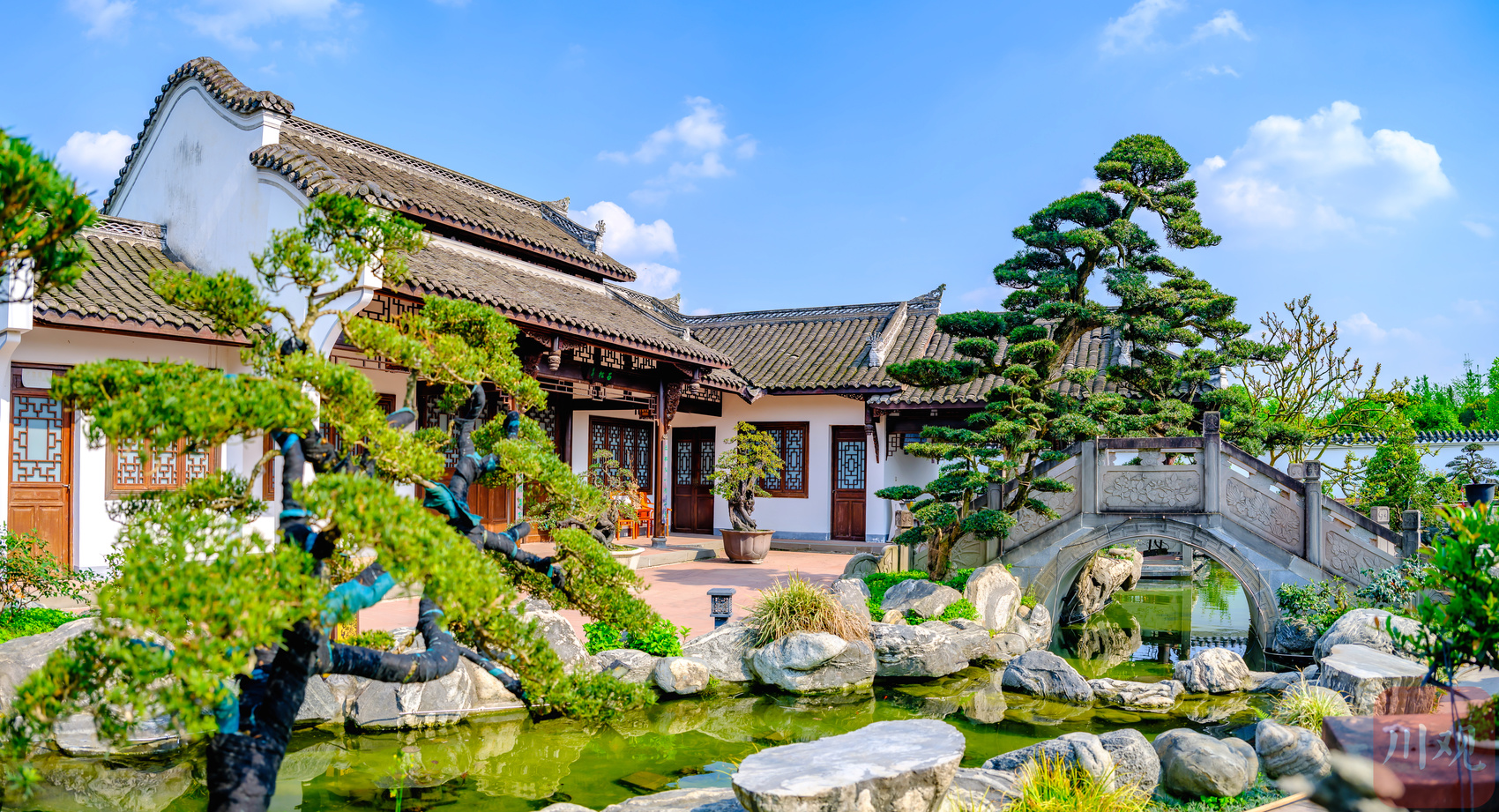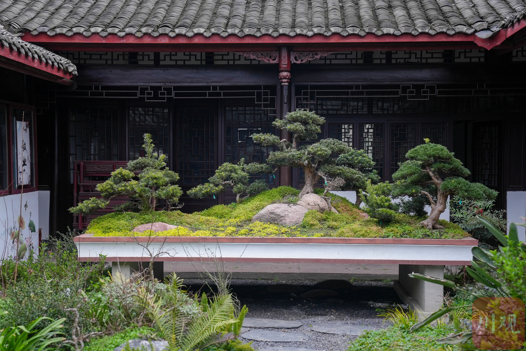 汉服爱好者穿梭于川派盆景其间,配上白墙青瓦,宛如一幅水墨画。