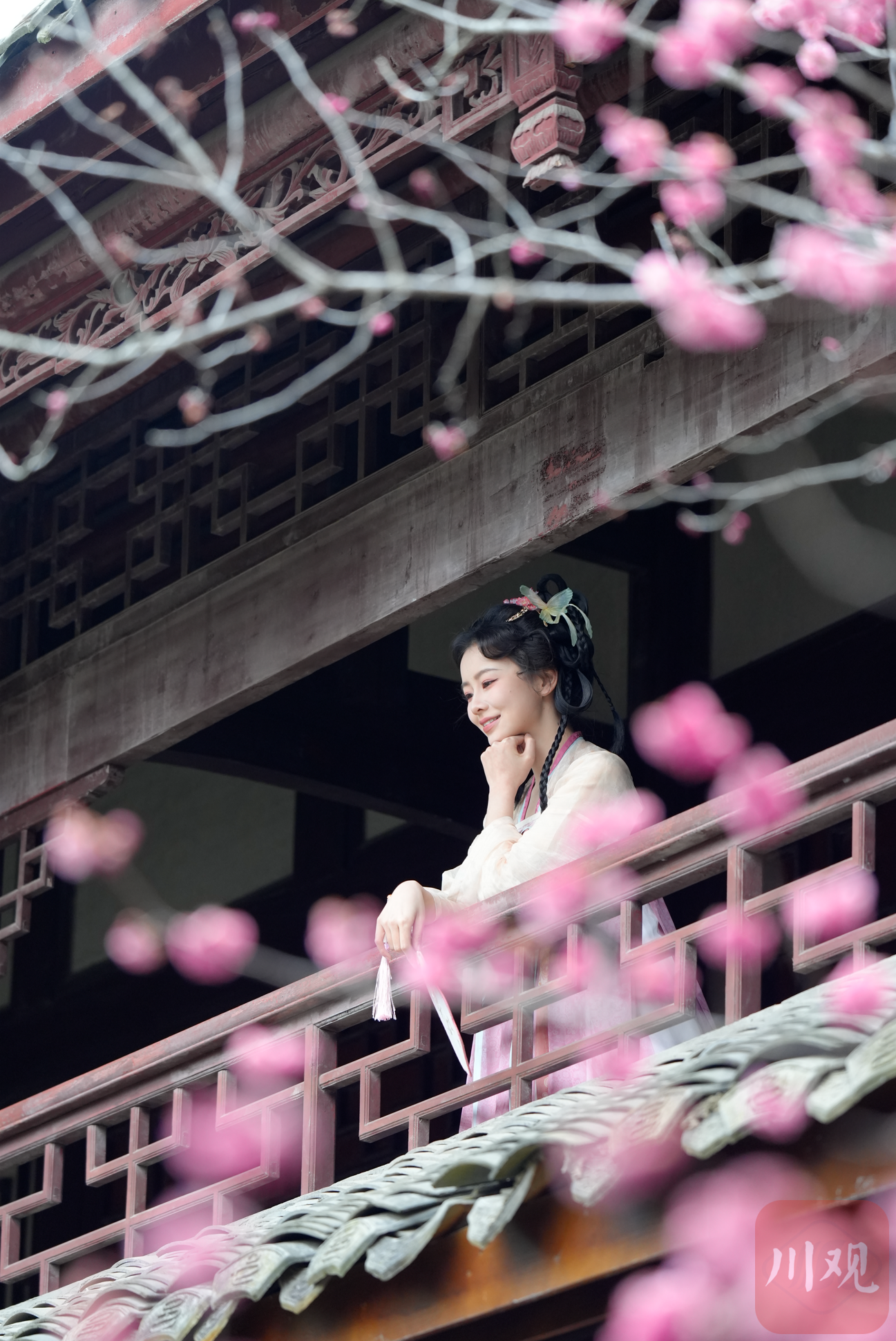 千姿百态的川派盆景再配上海棠花、梅花争奇斗艳,两位汉服爱好者穿梭其间,宛如一幅水墨画,吸引了摄影家们驻足创作。