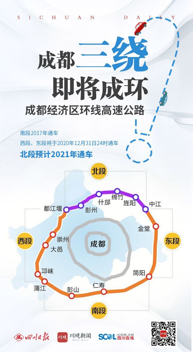 12月31日,记者从省交通运输厅获悉,成都经济区环线高速公路(即成都“三绕”)的蒲江至都江堰段(西段)、德阳至简阳段(东段)将于12月31日24时开通试运营,加上已经运营的简阳至蒲江段(南段),成都“三绕”仅剩德阳至都江堰段(北段)在建。按照目前建设进度,该段预计明年建成,届时,“三绕”将实现“闭环”。