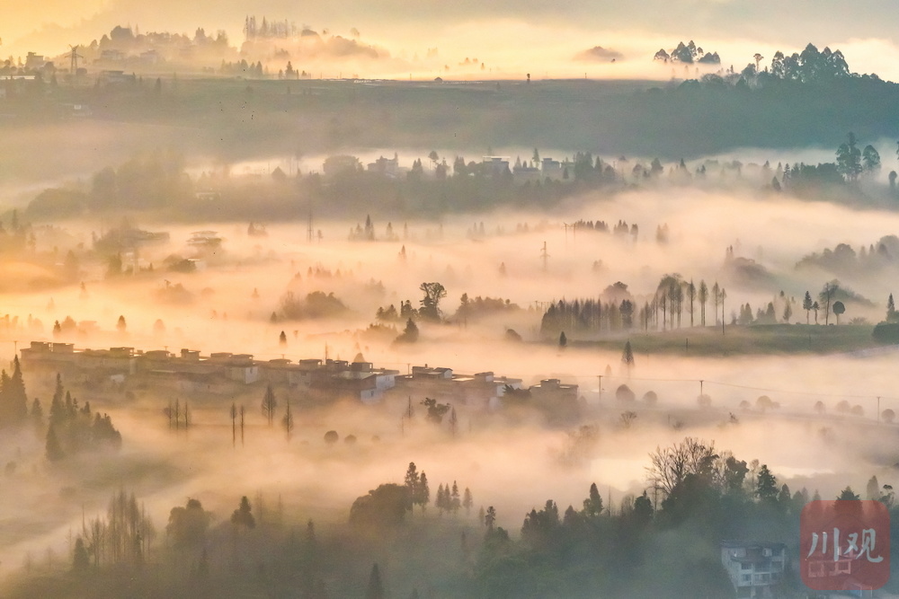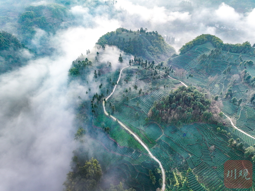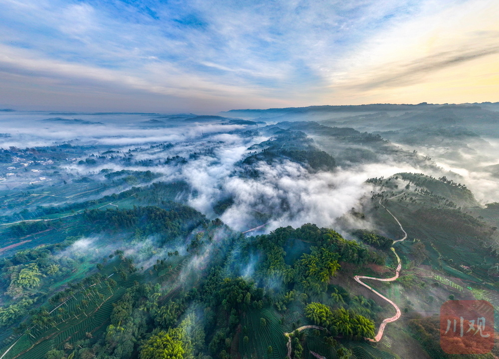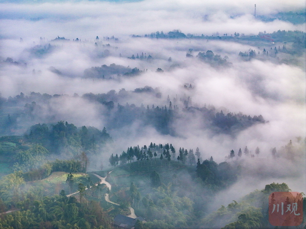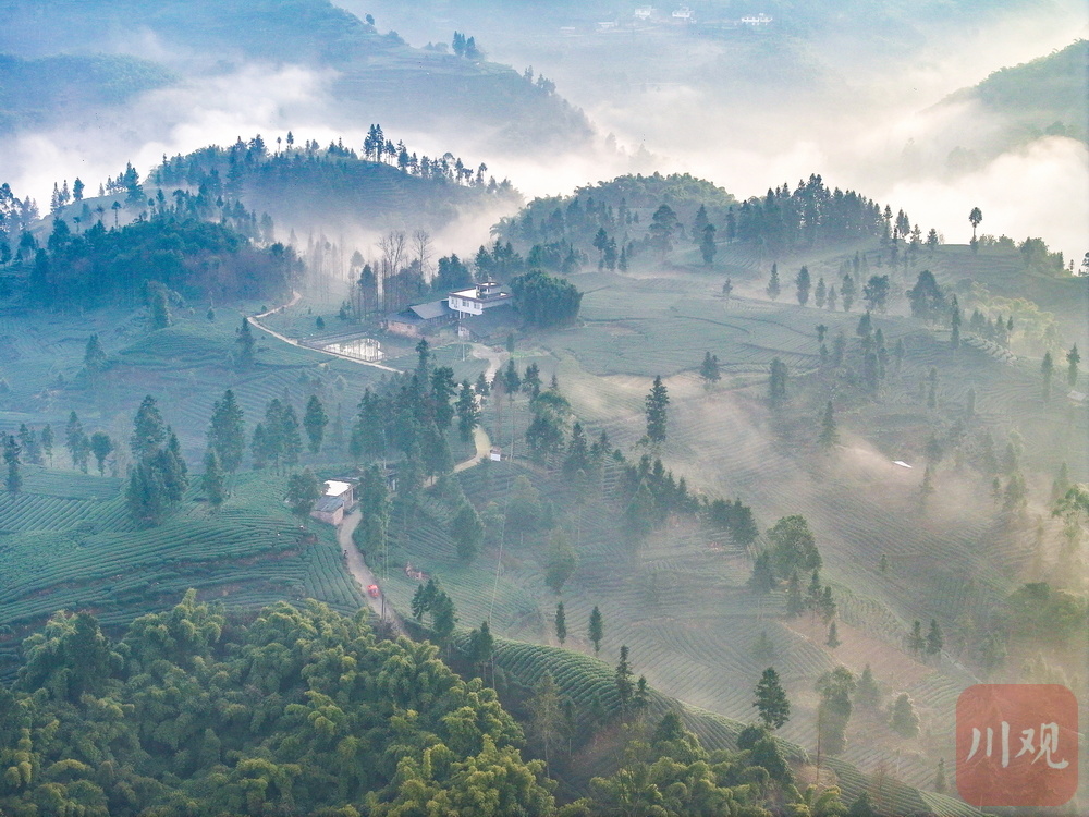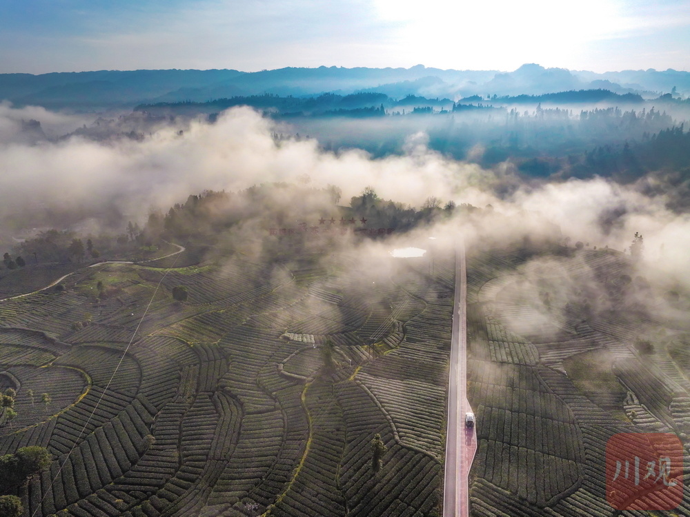 而在城市另一边,草坝镇云台山藏茶现代农业园区,在平流雾的笼罩下,阳光遇上水不断升腾,仿佛敖丙在《哪吒2》里释放的水雾,让村庄置身于一幅中国山水画之中。