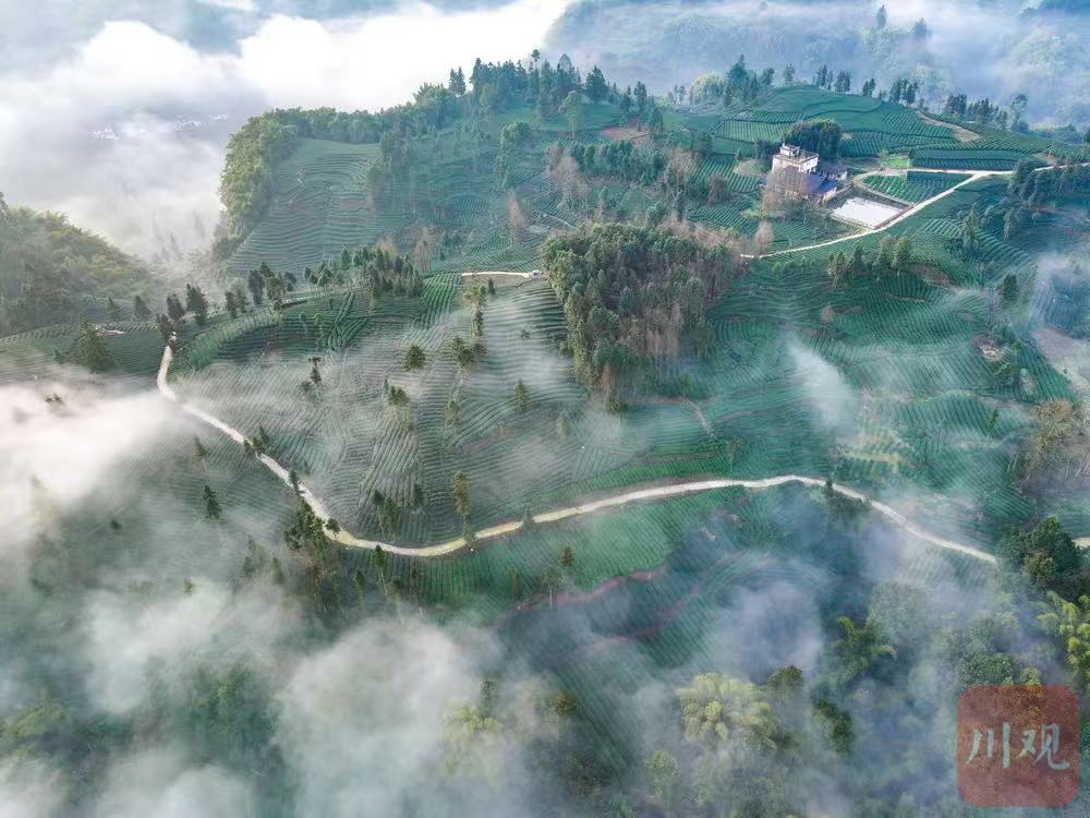 青衣江畔云蒸霞蔚,云台山上云雾缭绕,一轮红日冉冉升起,藏茶现代园区春意盎然,生机勃勃,好一派美好乡村的田园风光。