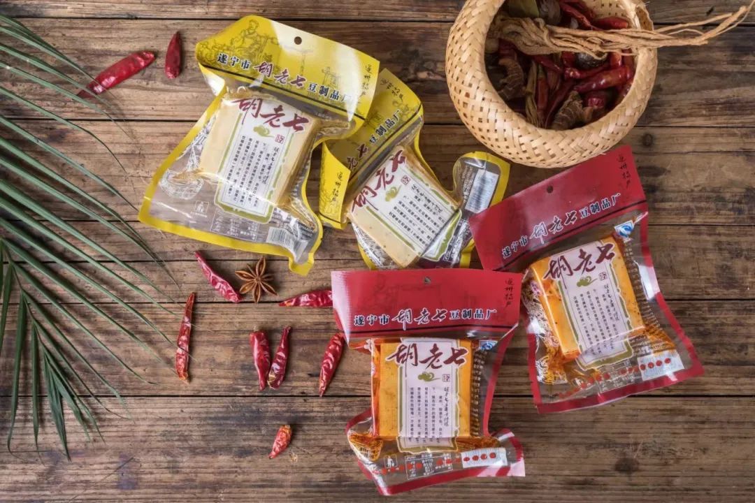 胡老七豆腐干是以豆腐为主材的遂宁风味名小吃之一。其传统制作技艺经过胡氏家族五代人上百年的工艺积累和提炼,是采用天然大豆、花椒、麻油等原料,经卤、煮、涮油、拌制等十多道工序精心独创的特色食品。从选料到成品的每一个步骤都融汇了传承人的心血和汗水,呈现了传统食品工艺的天然特色,色、香、味、营养俱佳,其色泽金黄,表面纹面细致,薄如皮影,嗅之清香扑鼻,嚼之味香质软,回味无穷。让遂宁人有“餐餐均想食,闻味归故里”的感觉,是遂宁人百年来的时代记忆,极富地域特色。