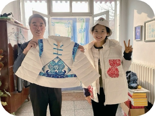 任志国(左)正在展示2022年冬奥会迎宾人员服饰。邢建荣 摄