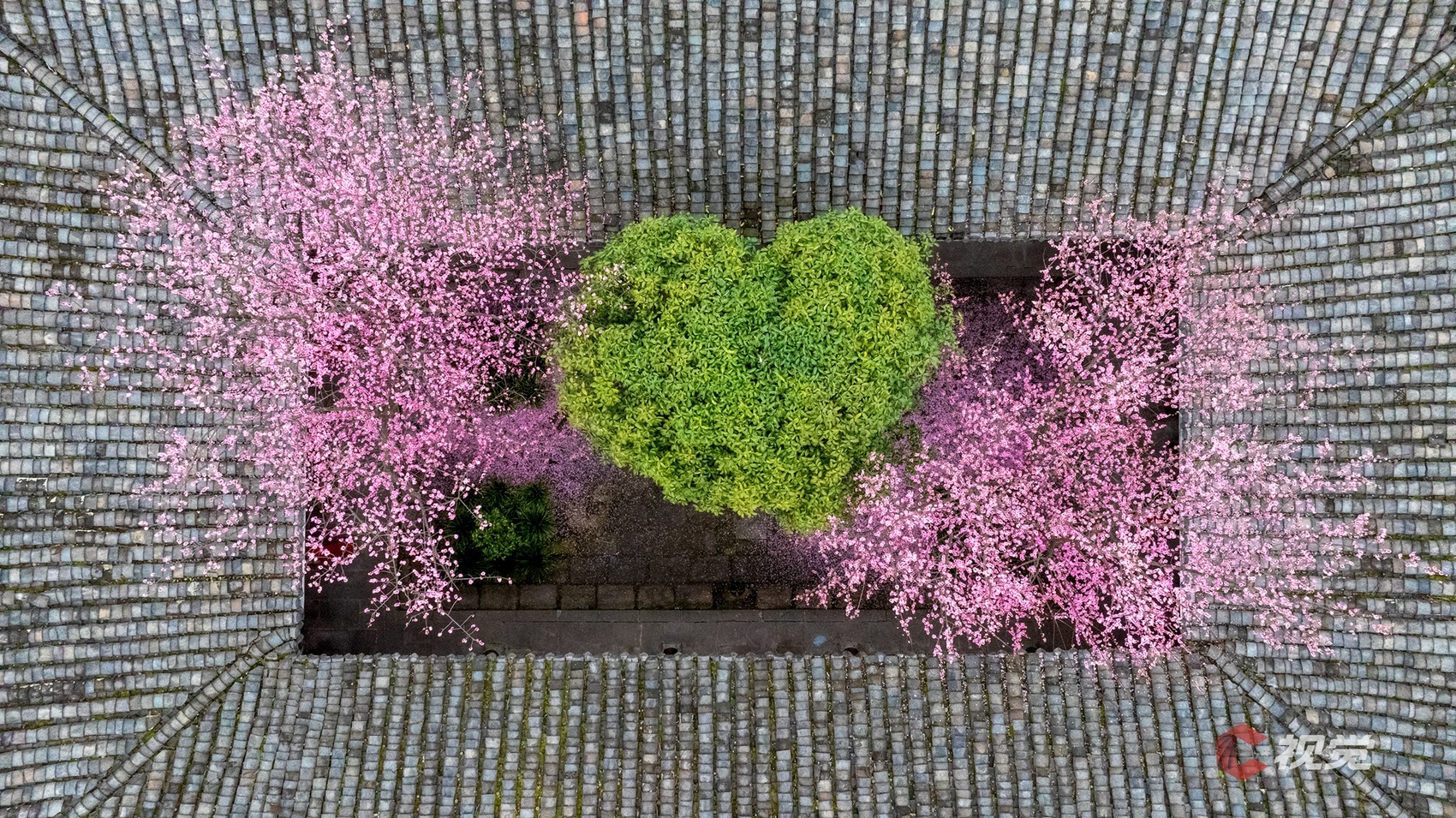 2月23日,古城院落中的红梅绿树组成了心形图案,唯美浪漫。C视觉 姚文顺 摄