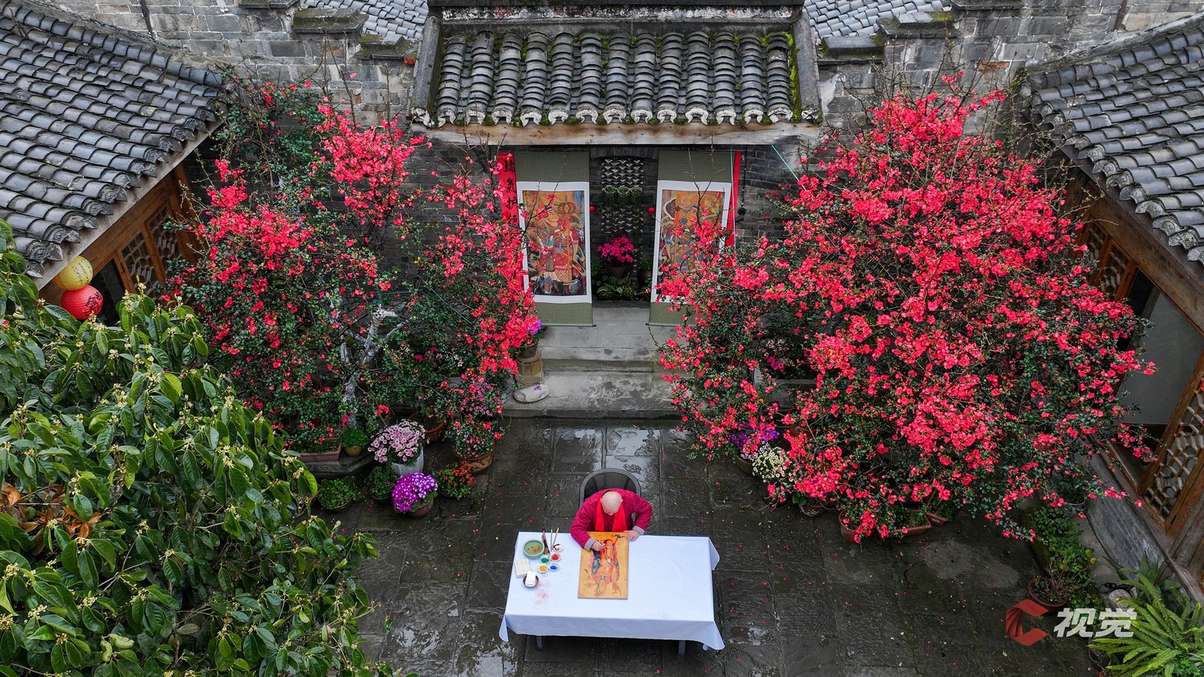 2月22日,门神画传承人张桅在艳丽的海棠树下作画。C视觉 姚文顺 摄