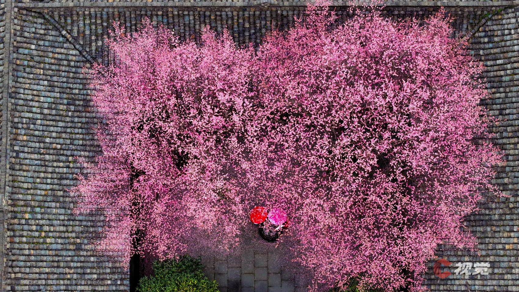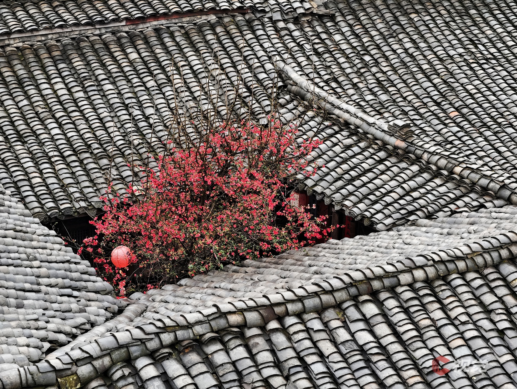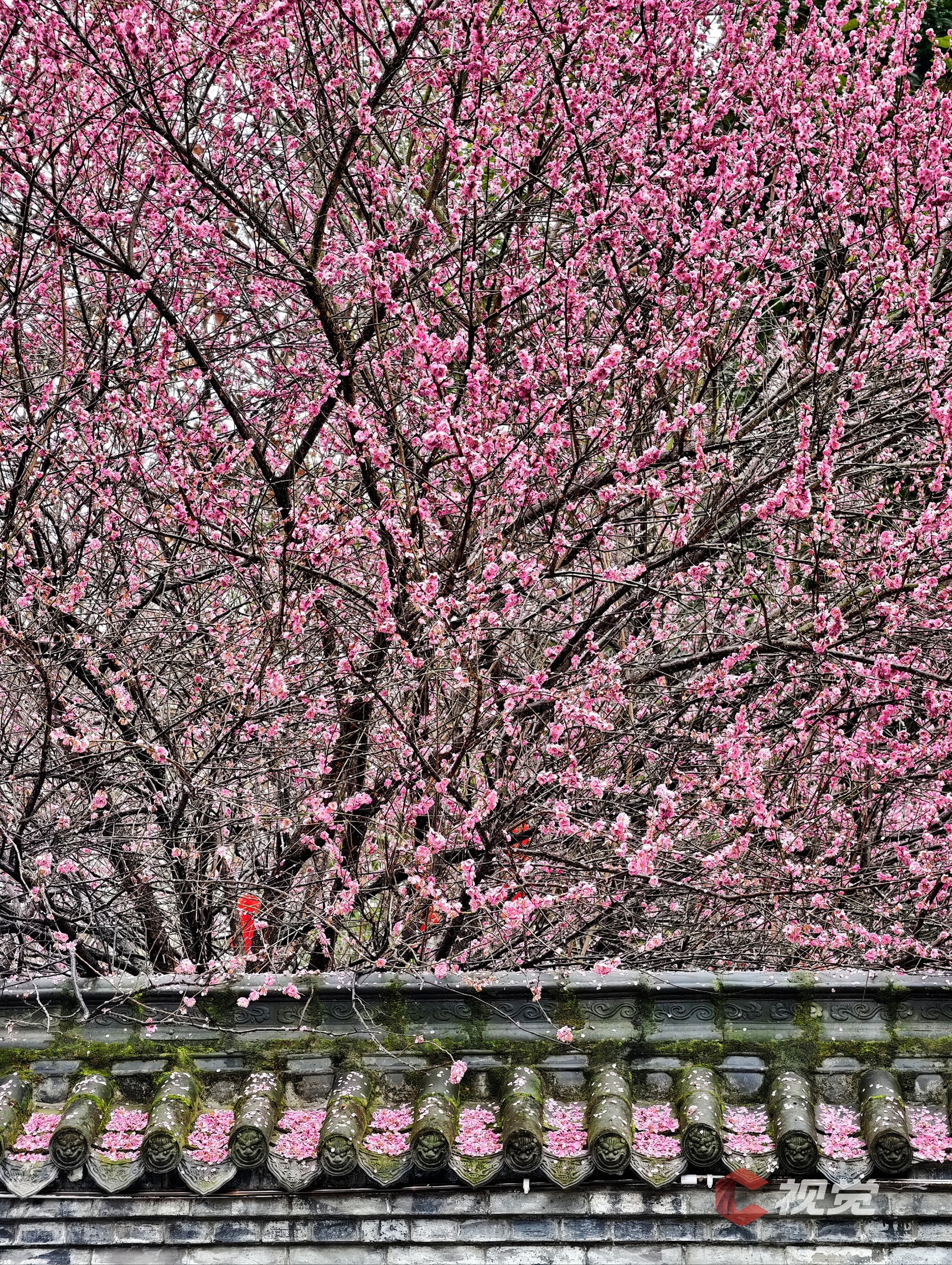 2月24日,红梅攀墙,如粉雾妆点古城青檐。C视觉 梁德 摄