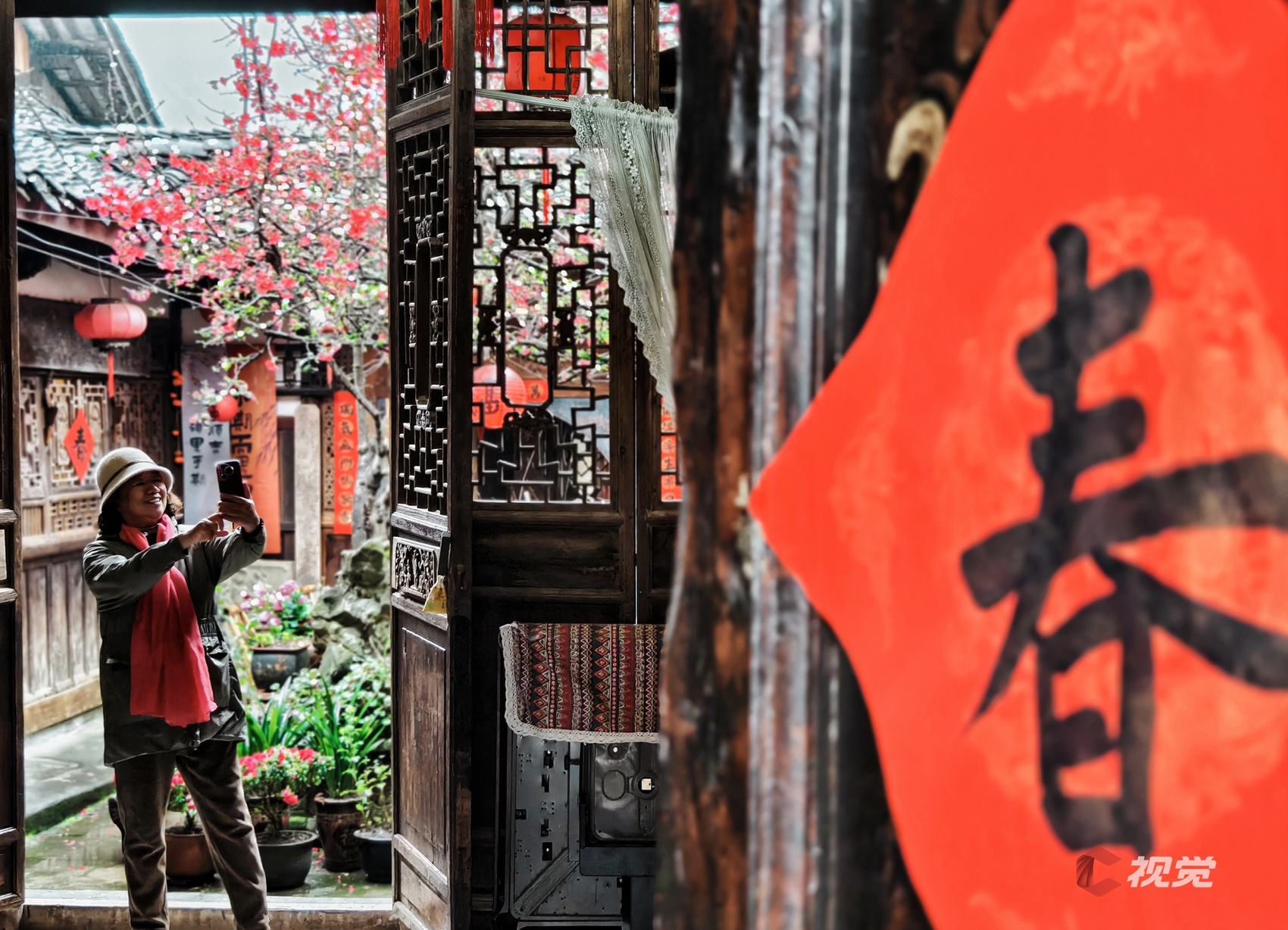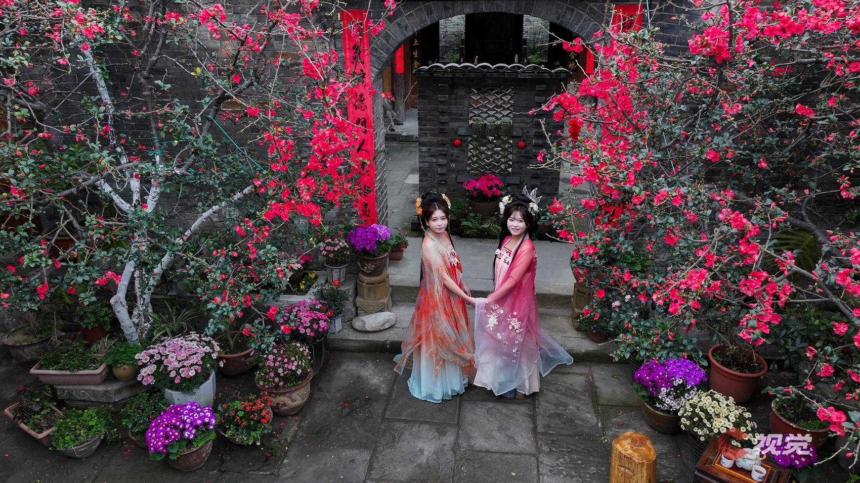 2月20日,身穿汉服的游客在古城院落中盛开的红梅树下翩翩起舞。C视觉 王玉贵 摄