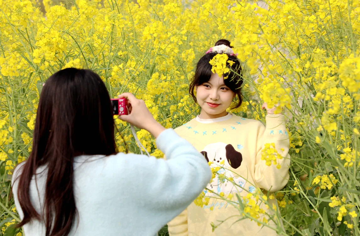 2月28日,在泸州市龙马潭区胡市镇胡市社区,连绵的油菜花进入了盛花期,变成了一片花田。在晴好天气助力下,不少市民来到油菜花田拍照、赏花,乐享春光。