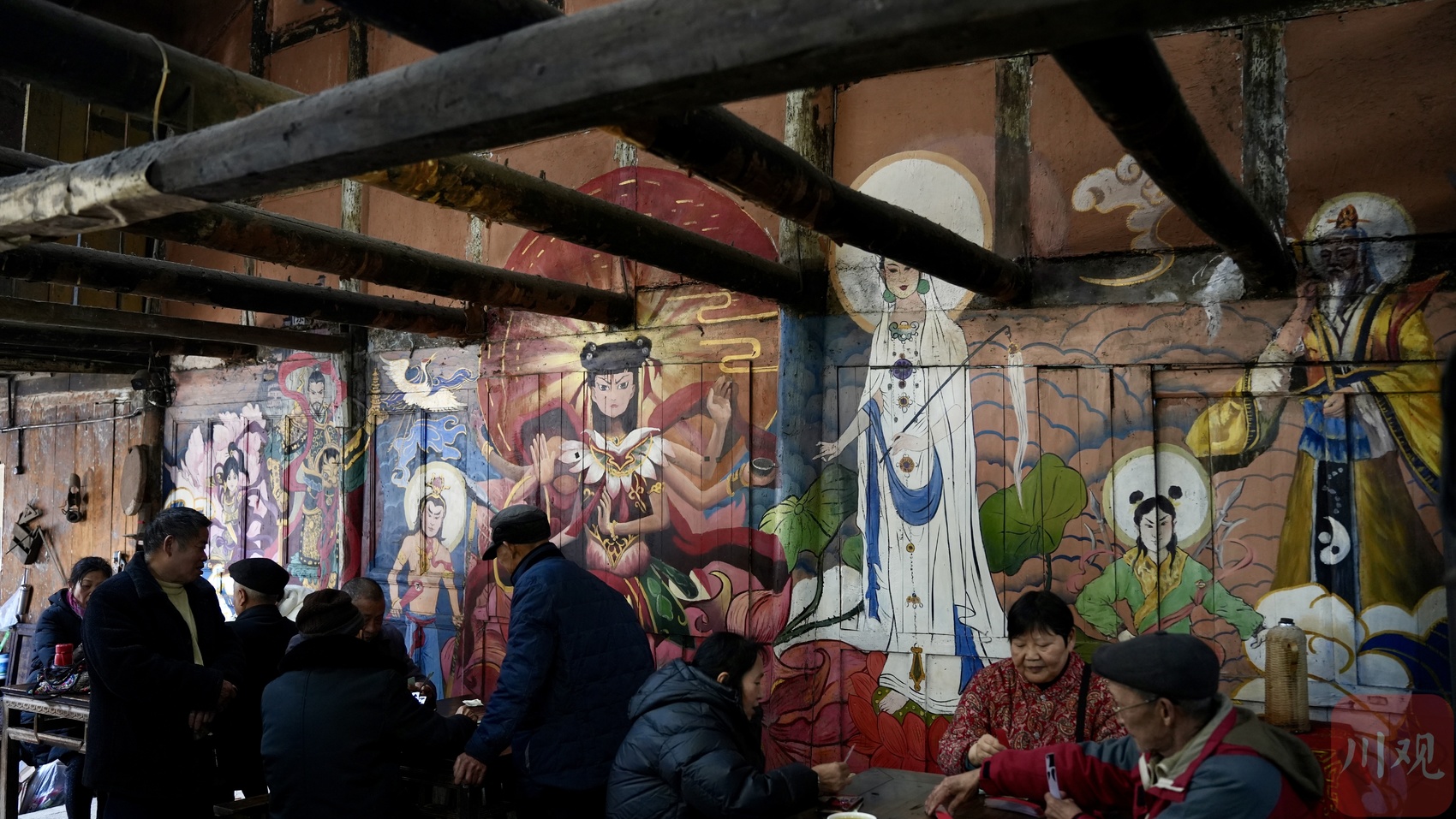 近日,一家藏在宜宾市叙州区岷江河畔泥溪镇的坤隆昌老茶馆,因馆内的哪吒墙绘火了起来,不少从成都和省外远道而来的游客追随“哪吒”来到了这里,打卡“哪吒茶馆”。